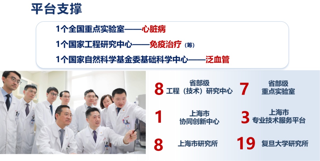 现有1个全国重点实验室——心脏病、1个国家工程研究中心——免疫治疗、1个国家自然科学基金委基础科学中心——泛血管介入复杂系统,7个省部级重点实验室、8个省部级工程(技术)研究中心、1个上海市协同创新中心、1个上海市专业技术服务平台、8个上海市研究所、19个复旦大学研究所。近十年获得国家科技重大专项、重点研发计划、国家自然科学基金等国家级项目1000余项;2014年至今,发表SCI论文6000余篇,多个高质量研究成果刊登在Cell、Nature、Lancet Oncology等国际顶级期刊。2007年至今,授权专利近1300项,并大力推进医学创新落地转化,实现成果惠民。医院主办的英文期刊《临床癌症通报》(Clinical Cancer Bulletin)入选中国科技期刊卓越行动计划高起点新刊。