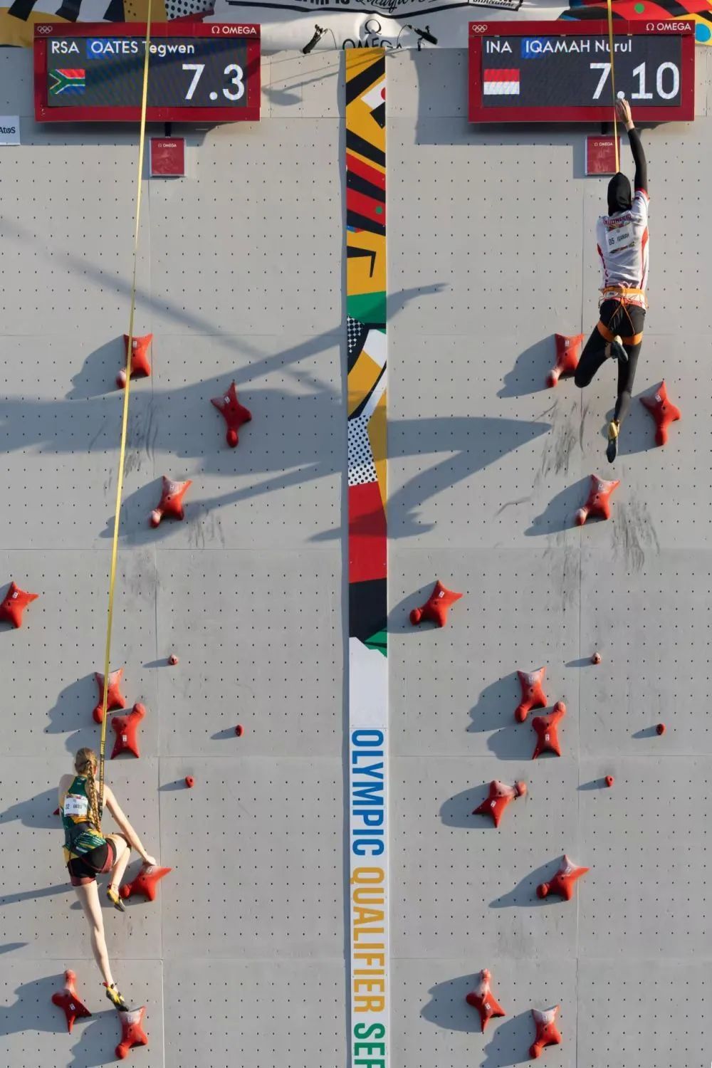 5月17日,南非选手特根·奥茨(左)在女子速度攀岩比赛中。新华社记者 王翔 摄