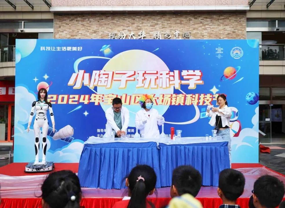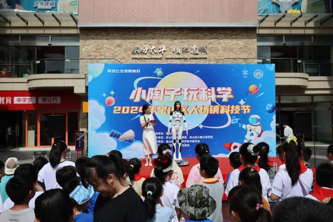 启动仪式由上海市宝山区嘉华小学刘炜晨老师与来自清宝引擎机器人公司的机器人美陶陶共同主持。真人主持和机器主持的互动,凸显了智能元素,汇聚了全场目光,启动仪式上,“空气架子鼓”的开场表演体现了艺术创作与科技的巧妙融合,三架无人机在空中灵活地穿梭,队形变化以及炫目的拉彩烟表演让孩子们惊喜连连,“大象牙膏”表演科普秀中,奇妙的化学反应制造出丰富多彩的泡泡,孩子们的眼中闪烁着好奇,惊叹欢呼声响彻全场。大场镇科技节宣布正式启动。