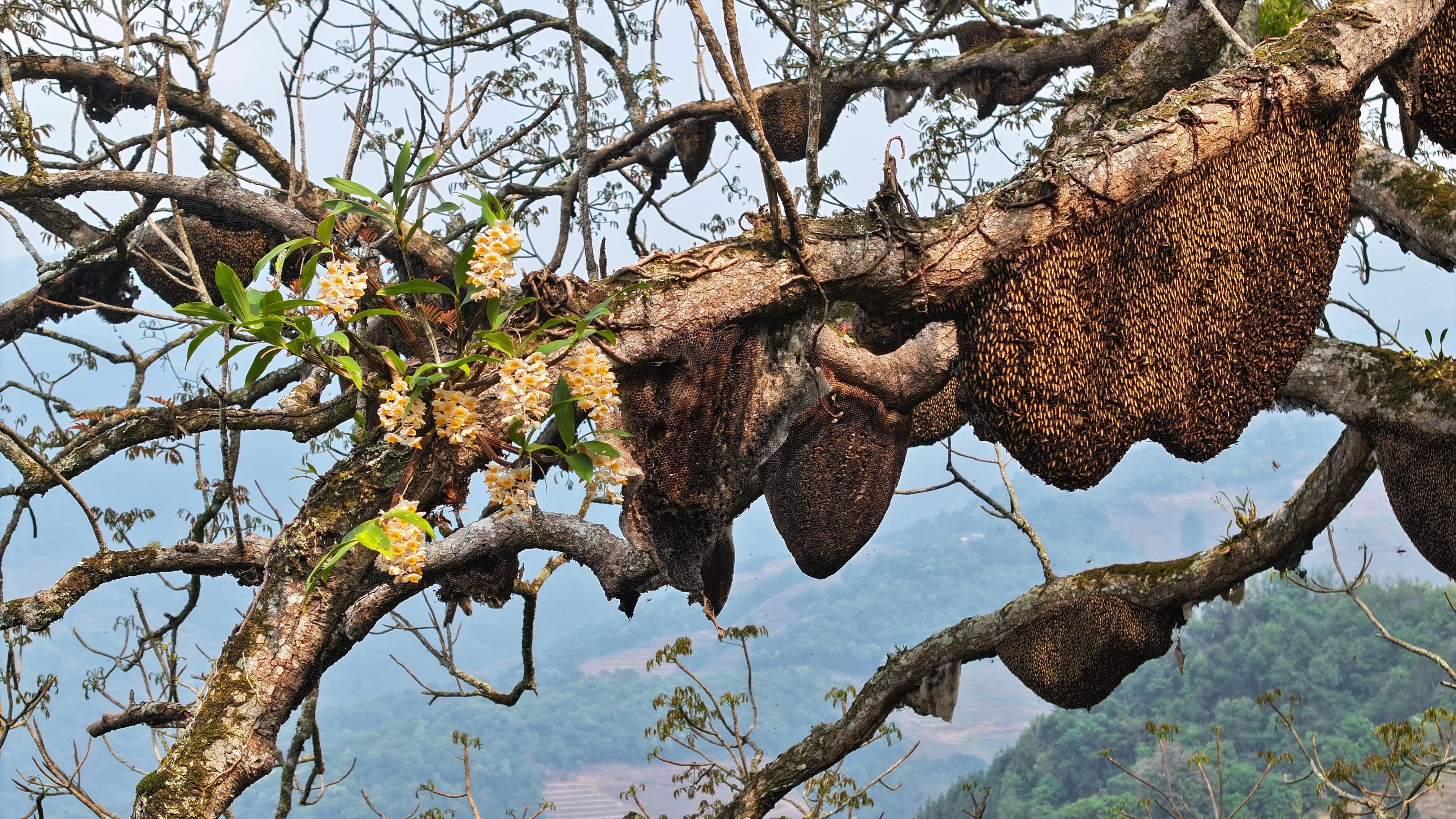 《蜂王树上的球花石斛与马杈蜂》 罗嘉 摄