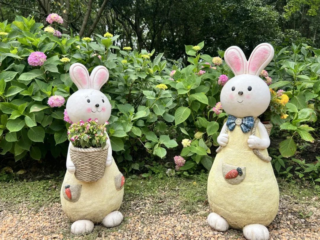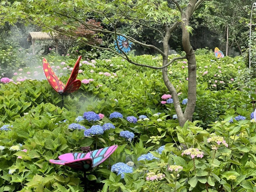 水雾弥漫,仿若踏入仙境。蝶飞蜂舞,道不尽园中缤纷之色。这一处八仙花园主题为“缤纷初夏”。园中共展示了50余个品种2万余株八仙花。而最具巧思的地方还要数园中摆放的园艺小品。
