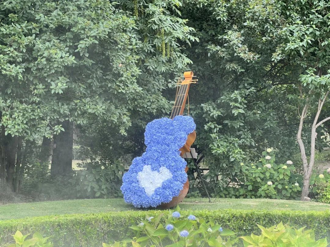 满载绣球花的大提琴,以靛蓝色为主基调,安静地绽放在花园一角。远看如静立的少女,近瞧又仿佛灵动跳跃的音符。仿真蝴蝶也成为了游客们的最好拍照道具,人在花中站,随手一拍,都有仙气飘飘的景观效果。