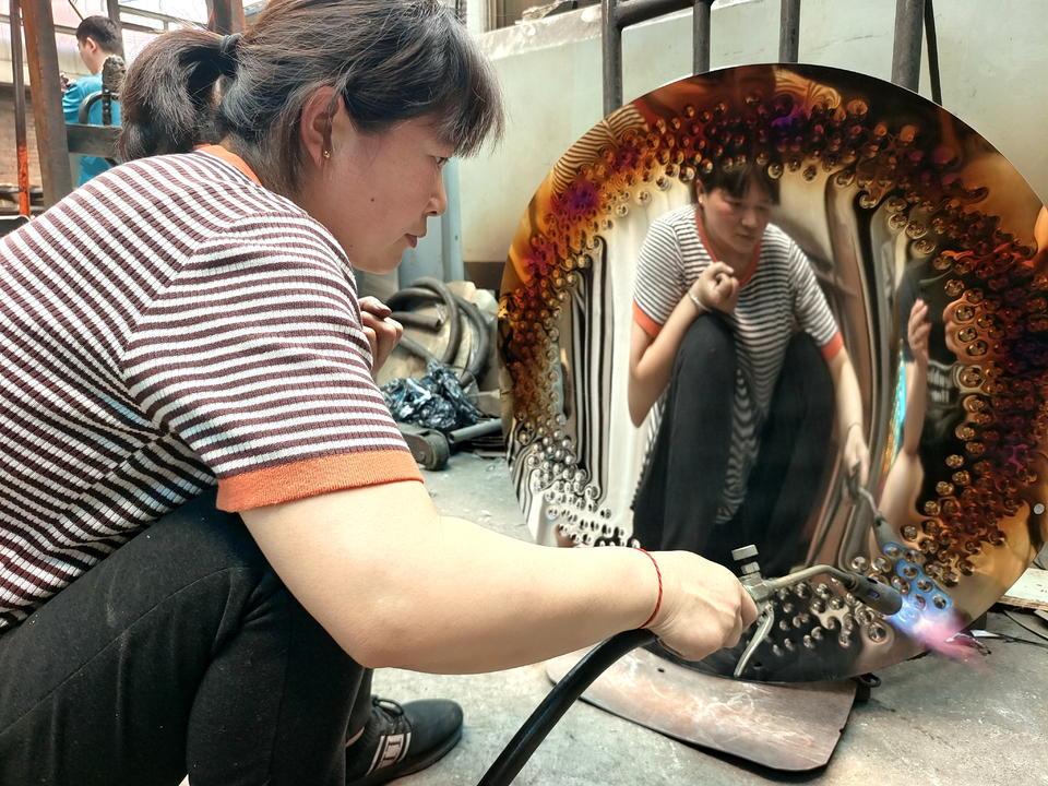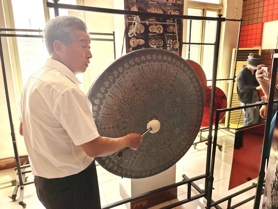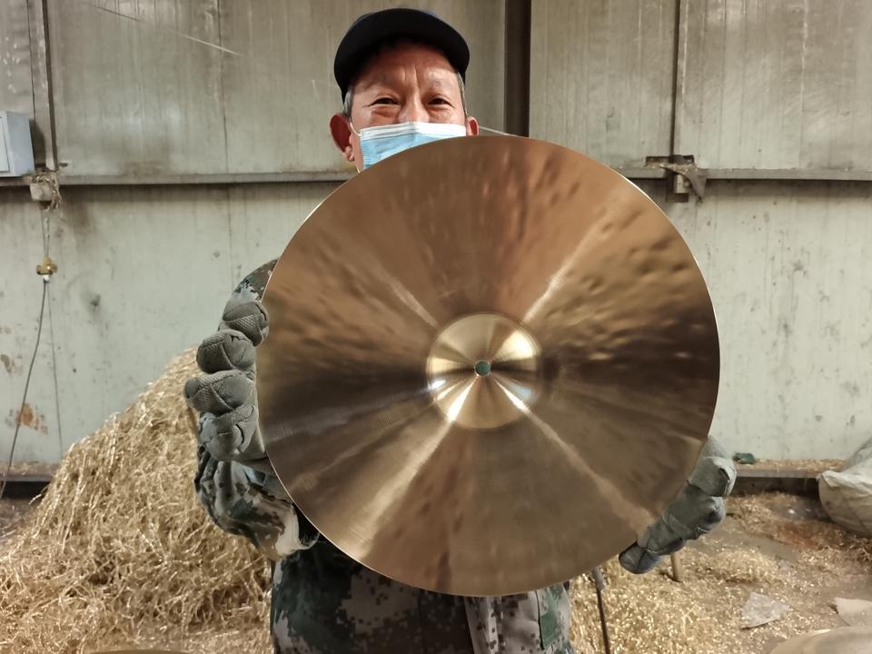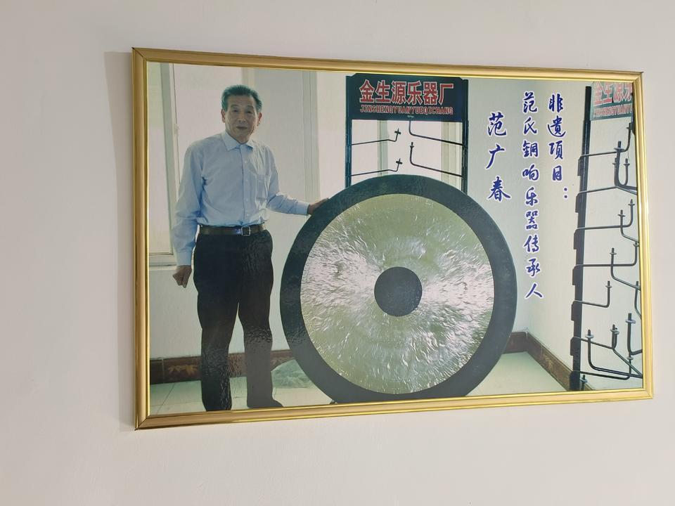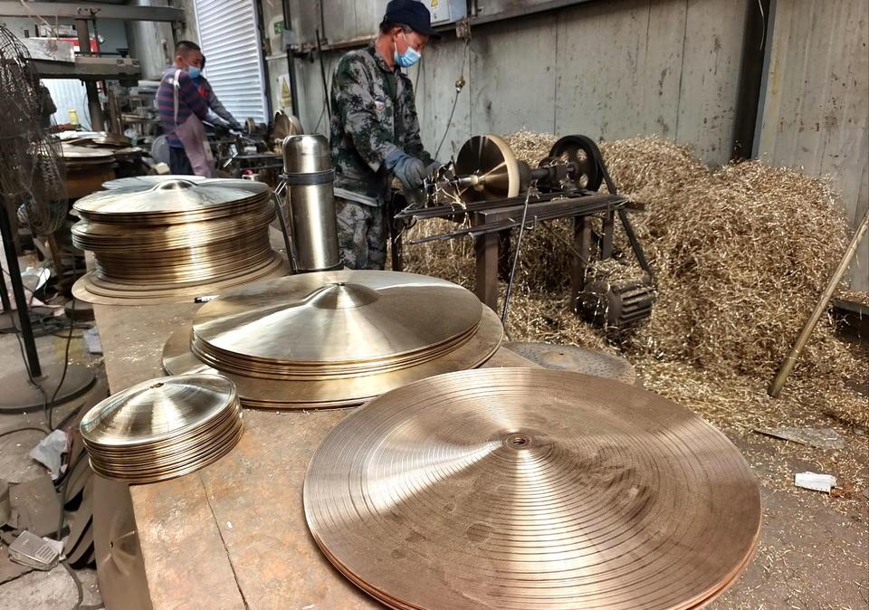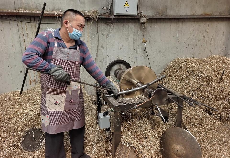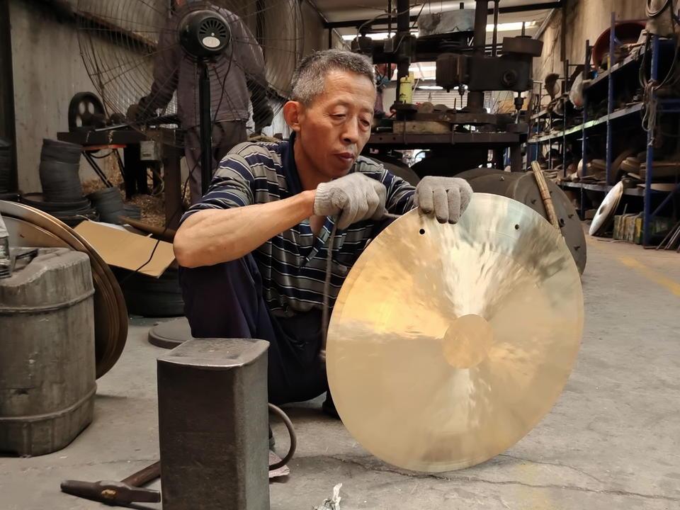 技艺高超的工匠们凭着敏锐的耳朵和灵巧的双手,敲打出音色纯正的镲和锣。目前范氏铜响乐器成为山东省内唯一可生产70寸以上大锣的厂家。