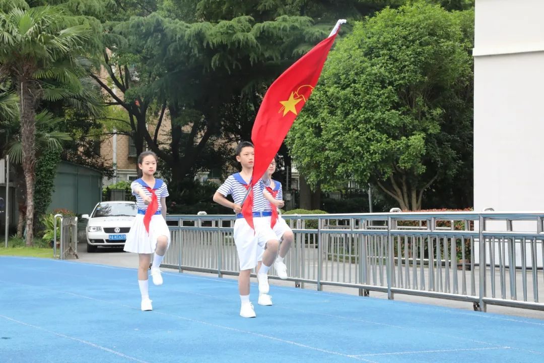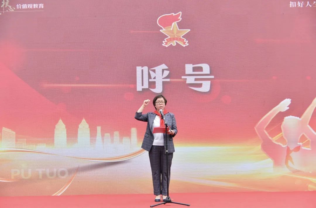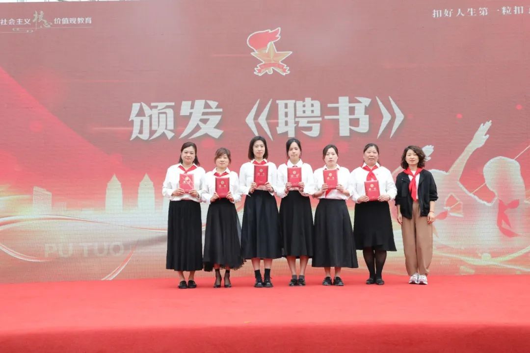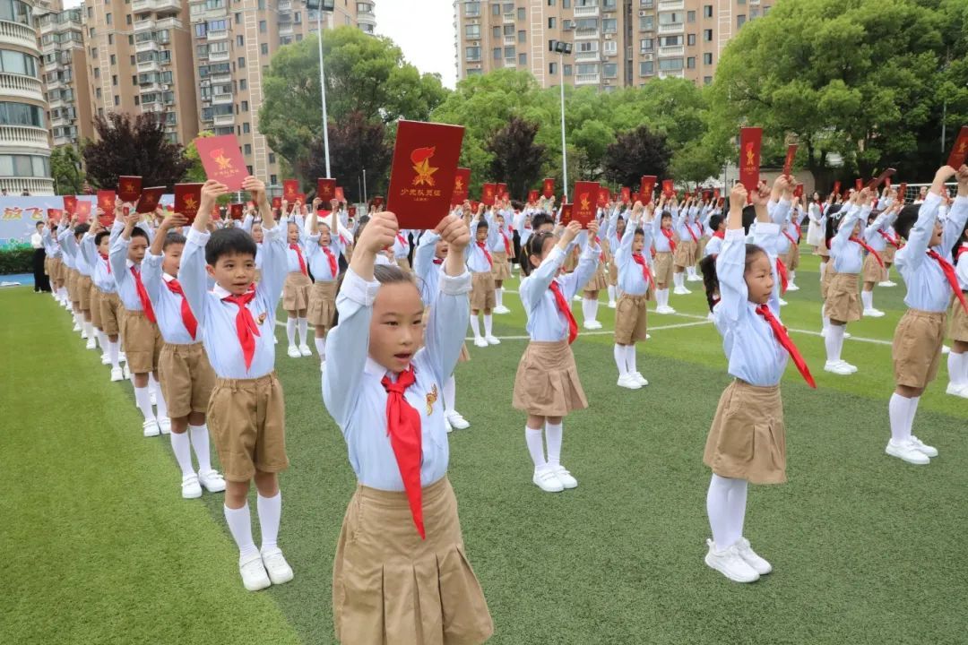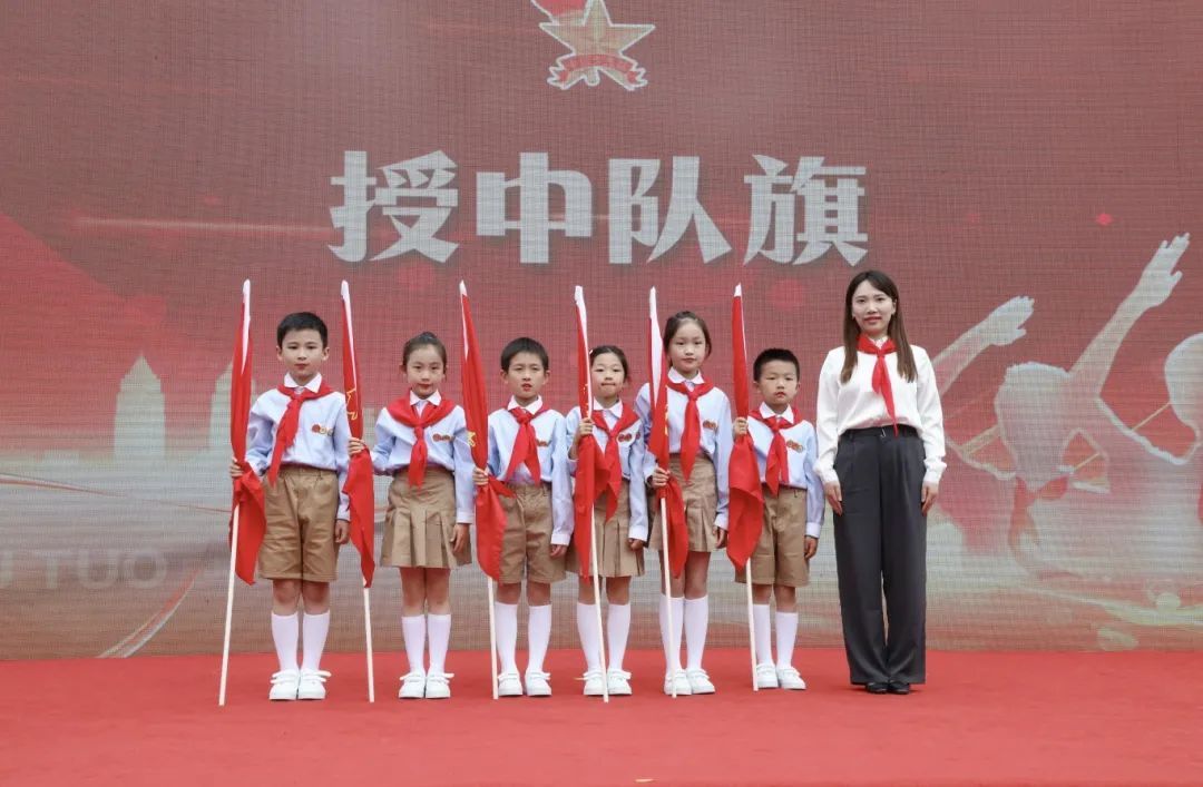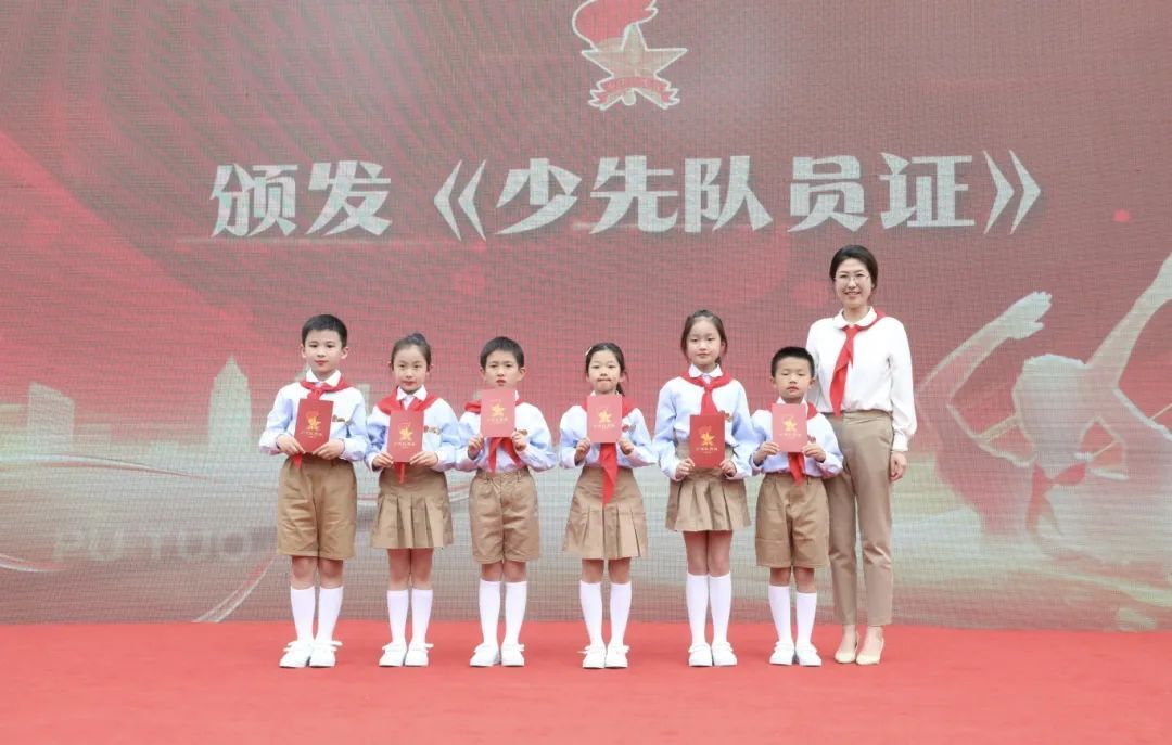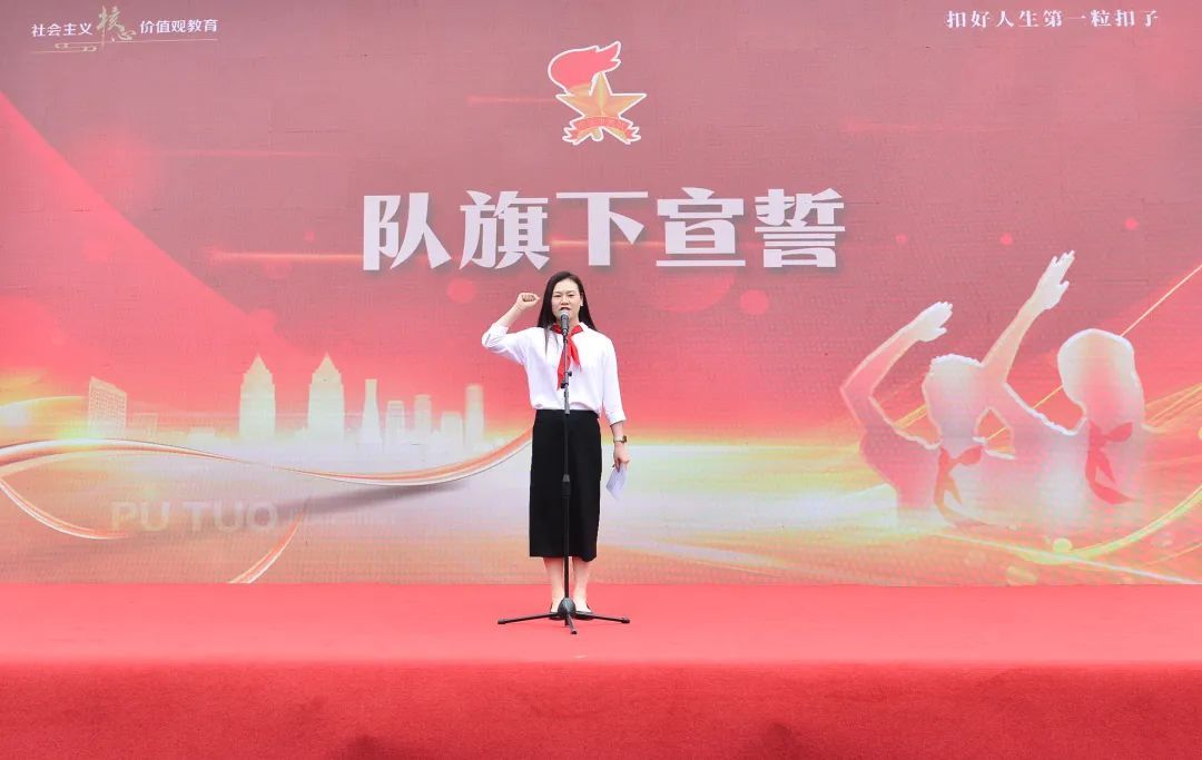 普陀区少先队总辅导员带领全体新队员,面对星星火炬队旗庄严宣誓,振奋人心的誓言久久回荡。现场还为新中队授中队旗,为中队辅导员颁发聘书。一批辅导员老师从此将成为队员们成长道路上的亲密伙伴,带领着中队逐梦未来。