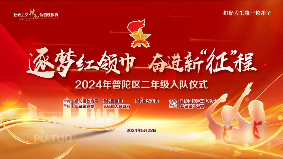 5月22日,普陀区二年级入队仪式在长征中心小学举行。本次活动由区教育局、团区委、区少工委、长征镇党委、长征镇人民政府主办,长征中心小学、长征镇少工委承办。
