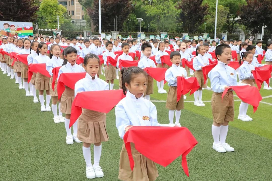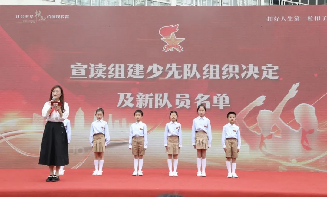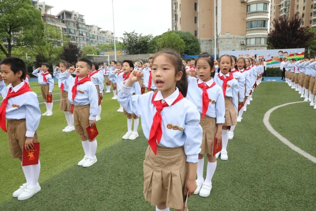 伴随着庄严的出旗曲、嘹亮的队歌,二年级的同学们整齐列队、昂首挺胸。活动现场,宣读组建少先队组织的决定和新队员名单,并为新队员代表授红领巾。新队员们纷纷诉说着心里话,一同戴上了鲜艳的红领巾。全场高举着一本本《少先队员证》,队员们光荣地喊着“我们入队啦!”