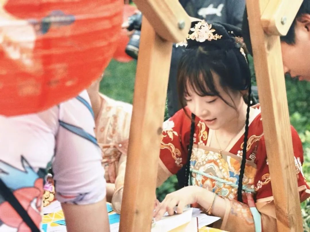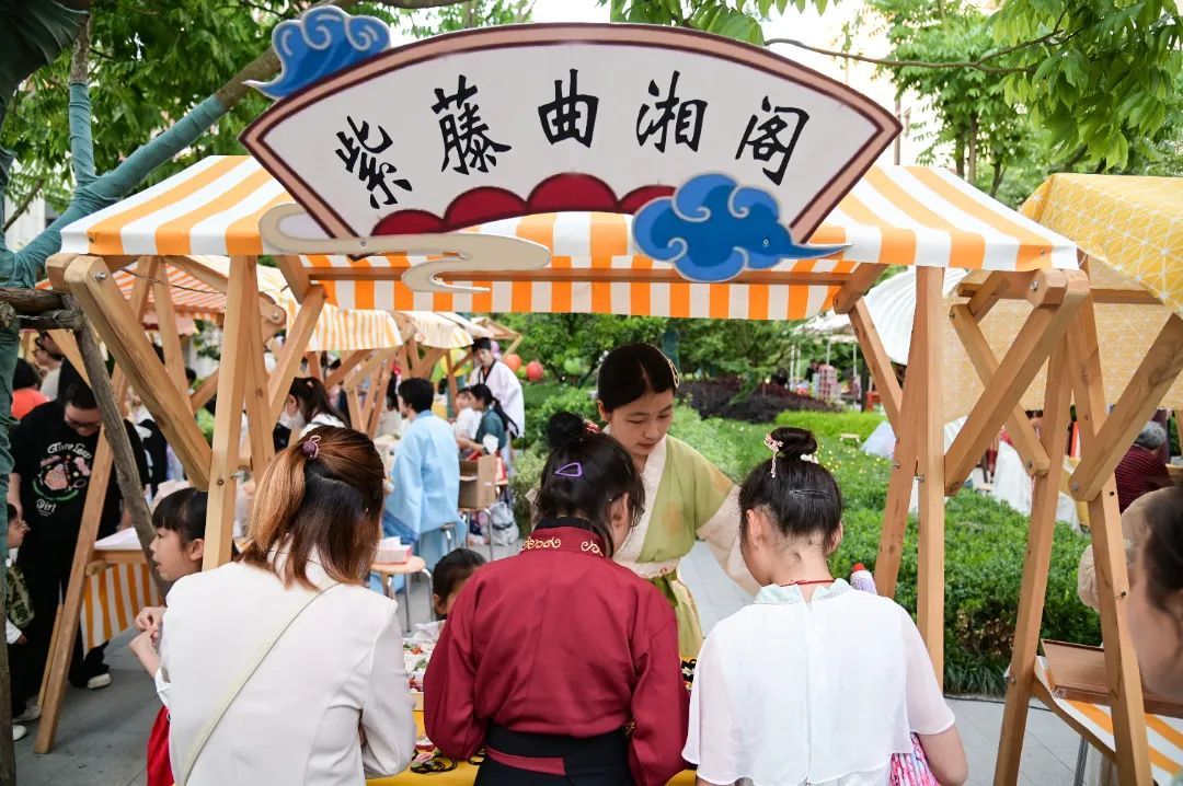 现场,随处可见青衫白褂、妆容姣好的汉服爱好者,三五成群逛着集市,或英姿飒爽,或娇俏柔美。