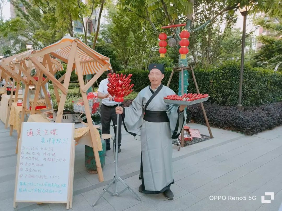 记者在小区门口的活动告示上看到,本次活动包括集卡印章(通关文牒)、桃花仙子桃花坞猜灯谜、江湖百晓生知识问答、飞花令、对楹联、姻缘阁柴道煌姻缘签、姻缘绳换取等,共有十数个极具特色的项目,均为社区居民自发组织和编排。