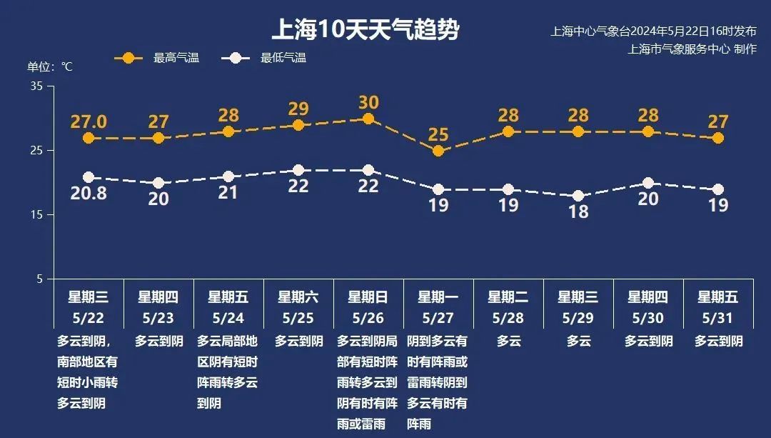 周日白天多云到阴为主,局部有短时阵雨,随着暖湿气流增强,雨势逐渐变大,并可能伴有雷电,气温22~30℃。