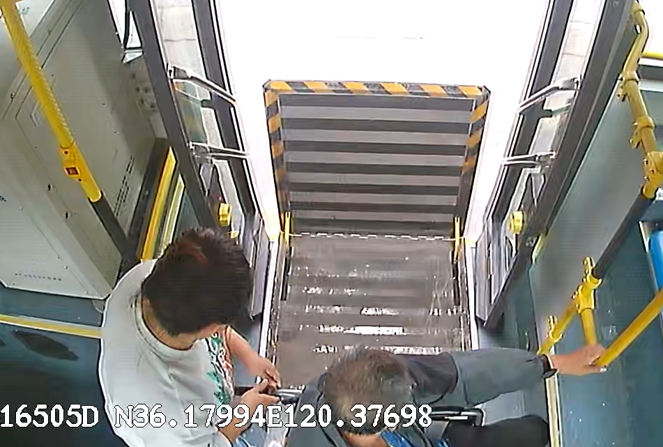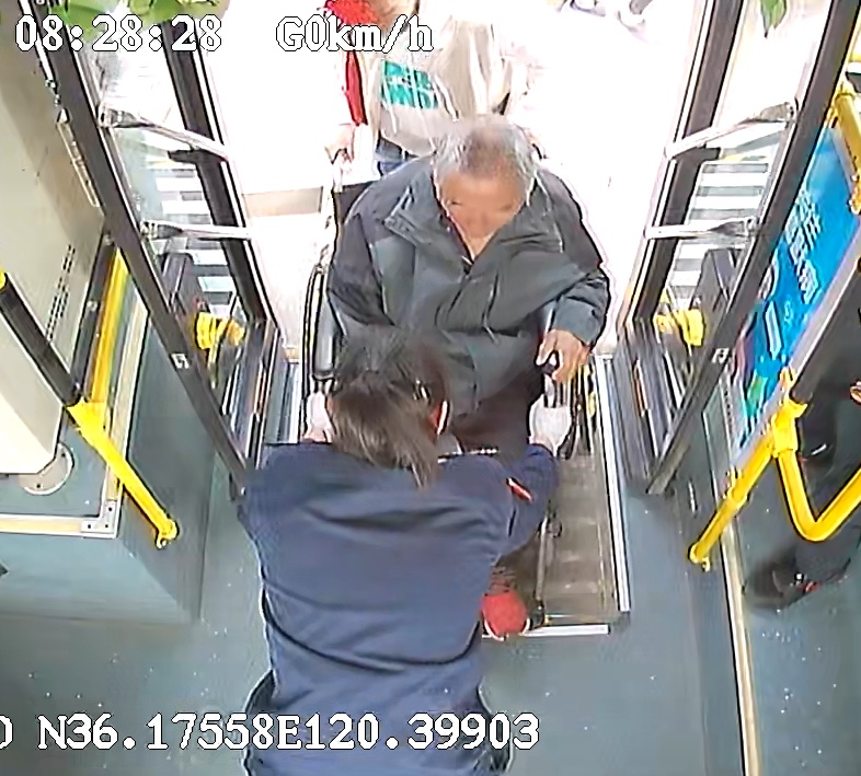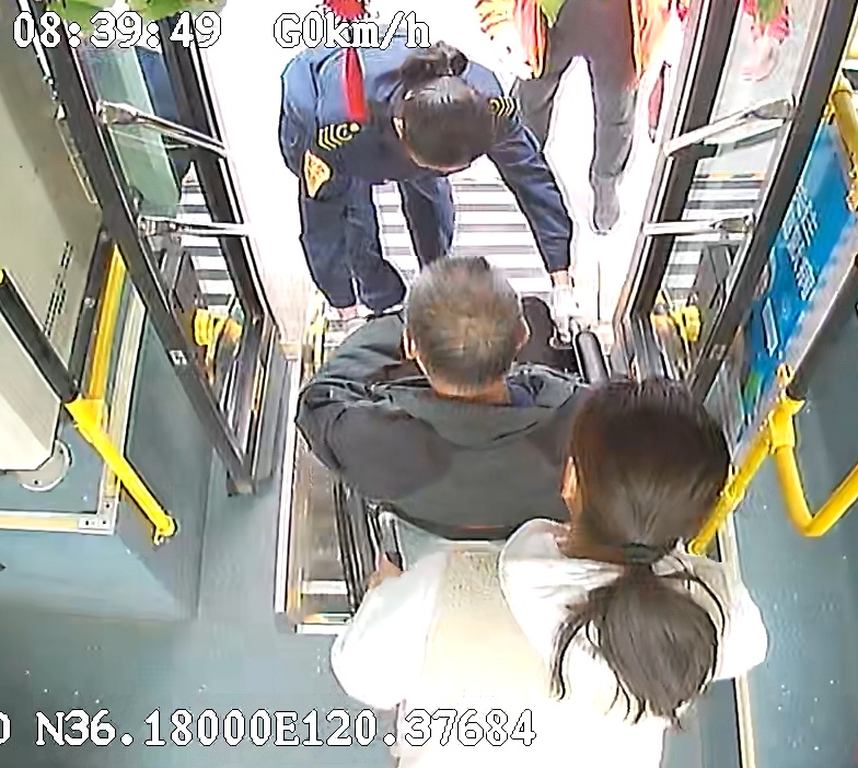 监控画面显示,打开踏板后,孟庆欣起身走到后门处,和老人家属一起将轮椅慢慢推到了车厢中,固定好轮椅后,孟庆欣叮嘱老人坐稳,并询问其下车地点,以便再次提供帮助。8时40分,车辆到达沧安路车站,孟庆欣将车停稳,待车内乘客纷纷下车后,她打开无障碍踏板,再次起身帮助“轮椅老人”下车。