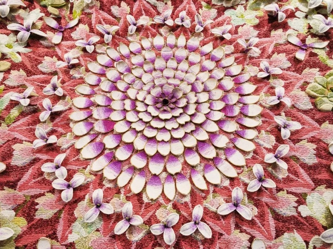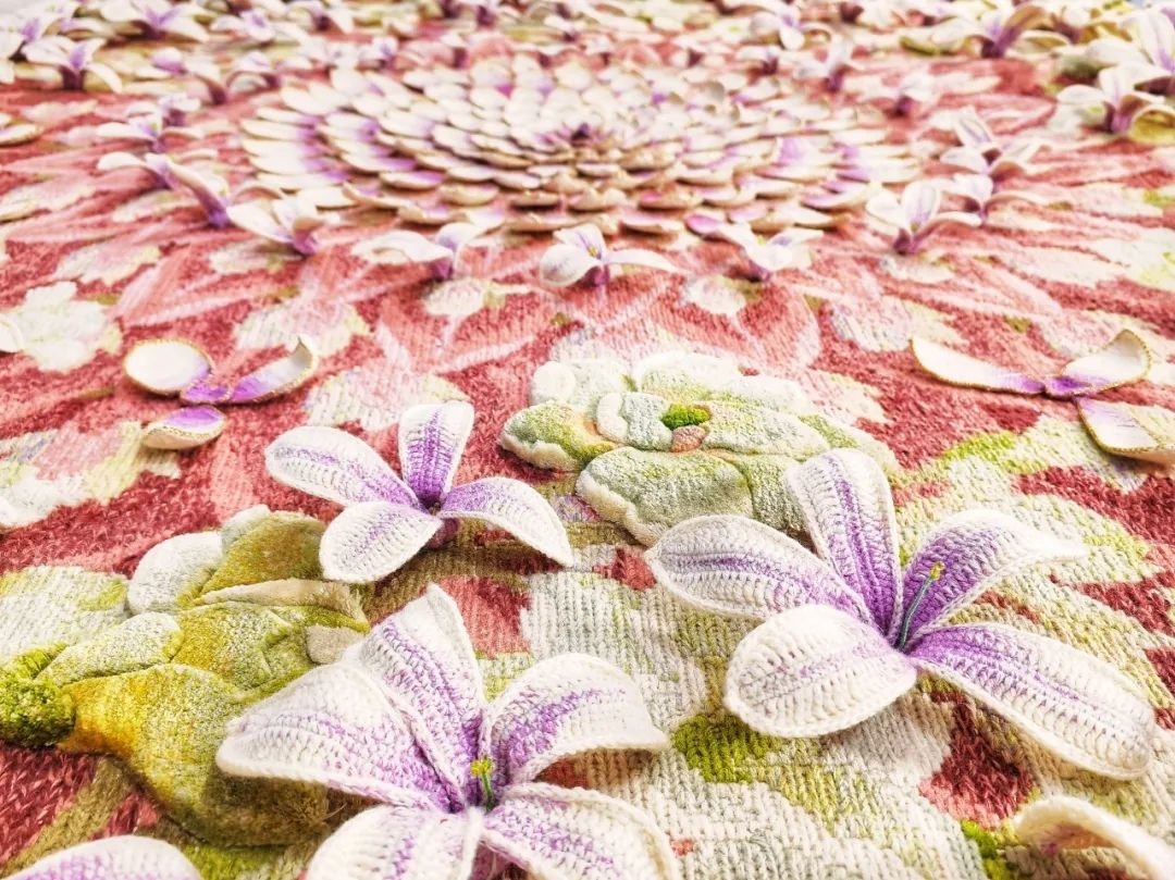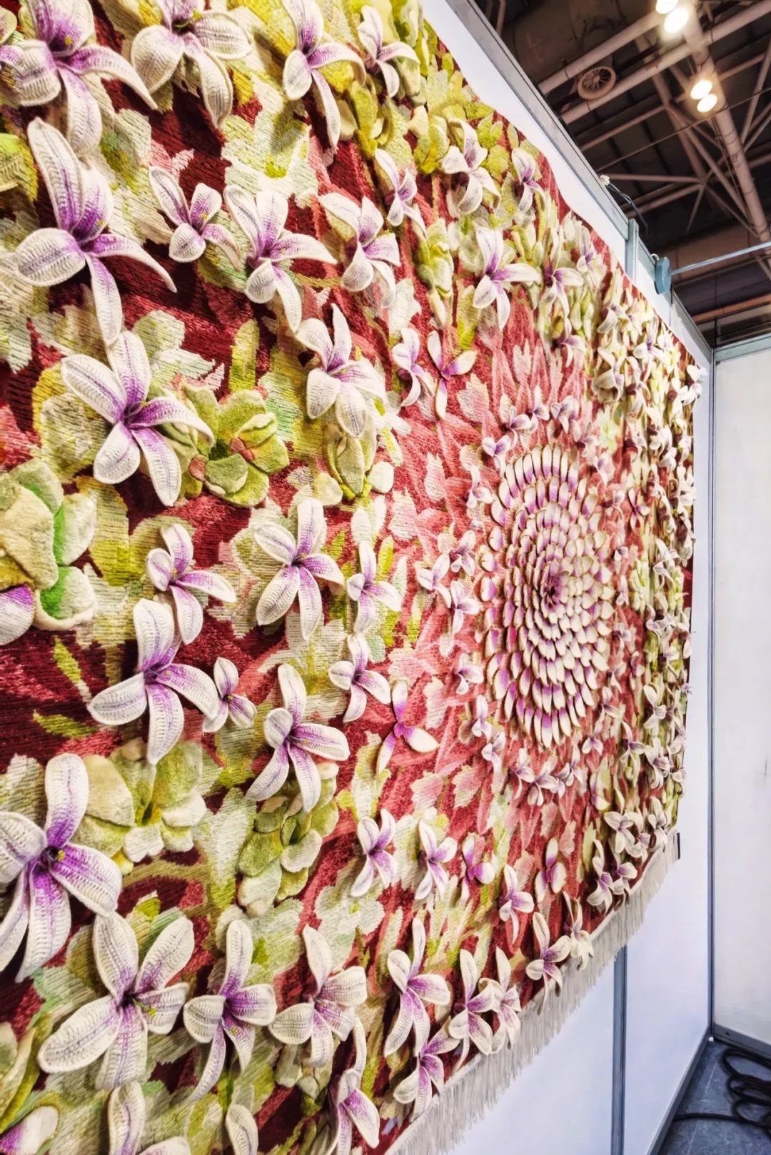 据了解,《白玉兰》作品以玉兰花为创作原点,整幅作品以手工编织的丝毯为底,各种大小不一的立体编织花瓣由内而外层层堆叠,展现了玉兰花开的勃勃生机,实现了编、织、钩、结等多种技艺的完美融合。