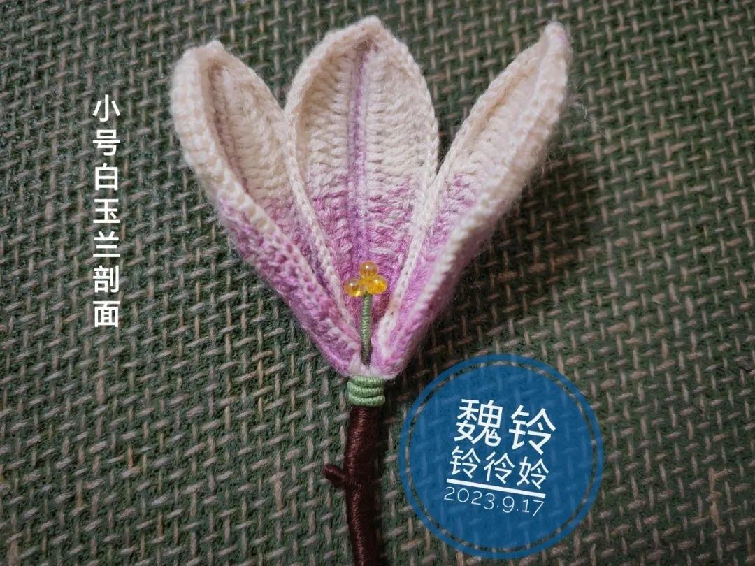 事实上,为了呈现出最好的效果,魏铃在作品设计之初就投入了大量的精力。在玉兰花开的季节,她每天都花几个小时去公园里搜集花瓣、观察花朵,尝试用不同材质的线模仿制作花瓣形态。为了更好地体现编织的整体性和技艺之美,她放弃了直接染色的捷径,而是改单色编织为韵色编织,并不断提高编织的难度,从最初使用1.5毫米的包胶铝条到最后使用的0.2毫米的铜丝定型,历时15个月最终完美呈现了玉兰花的生动形态。