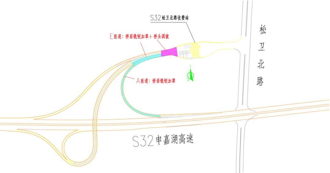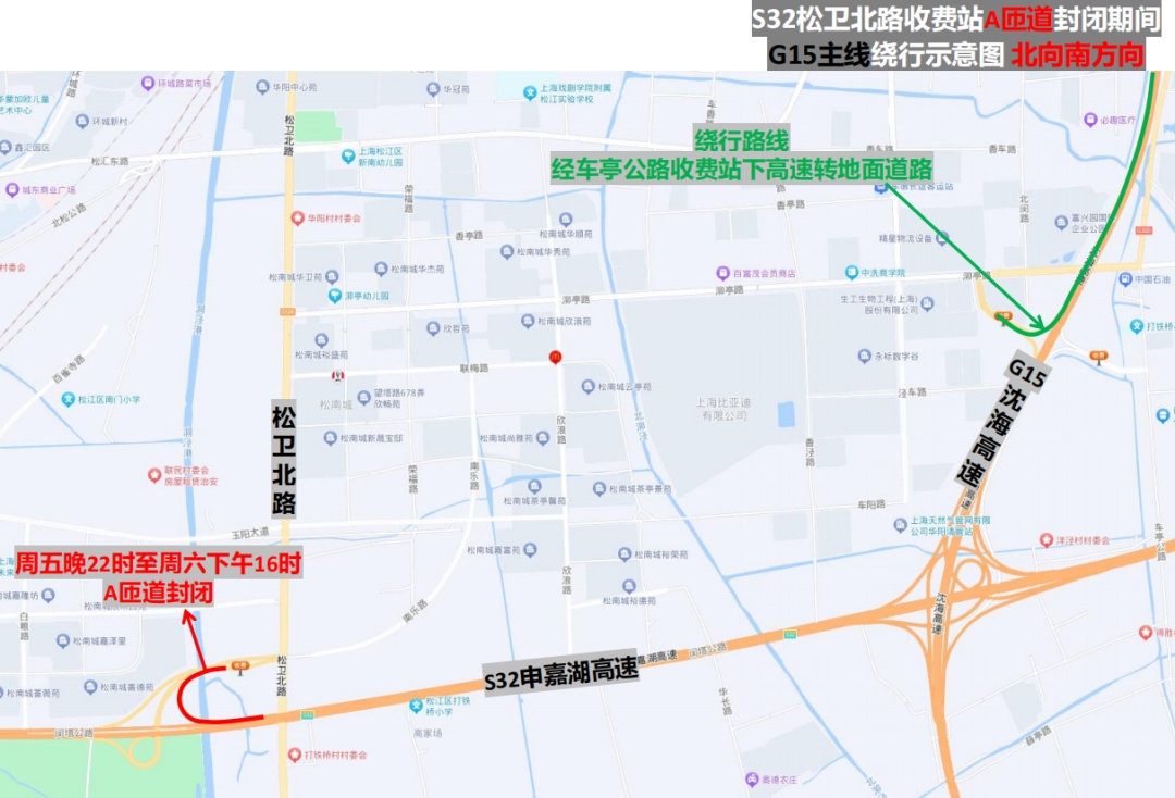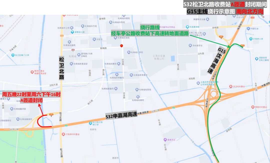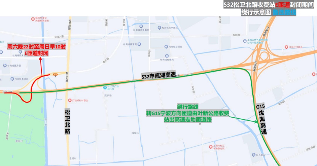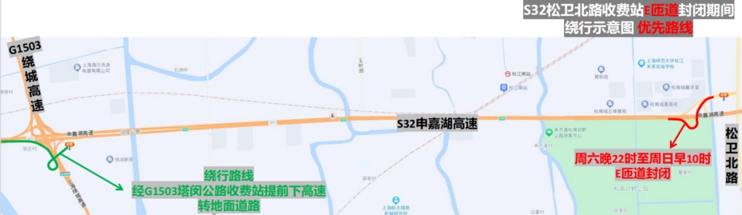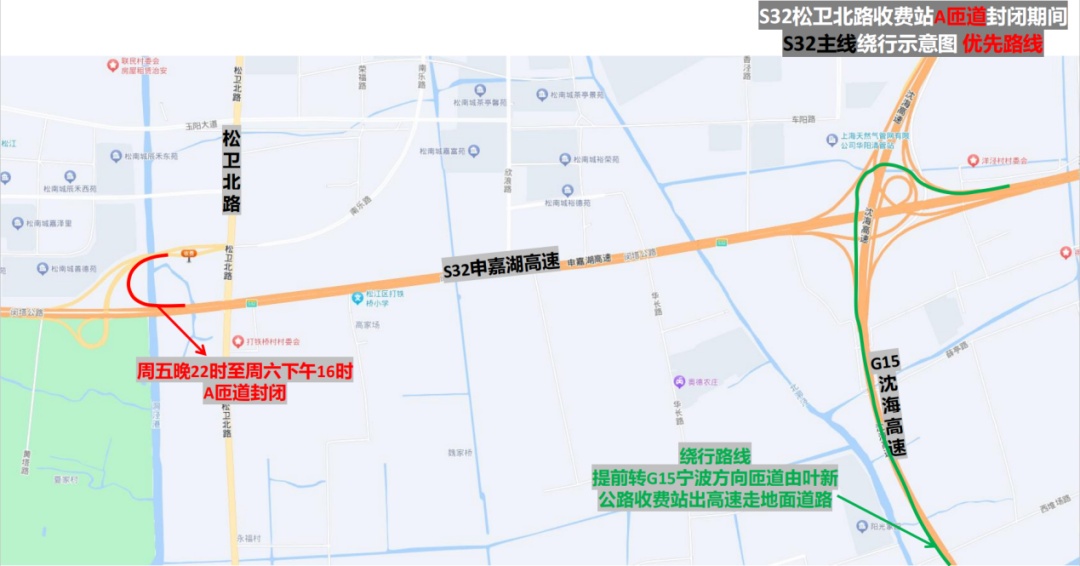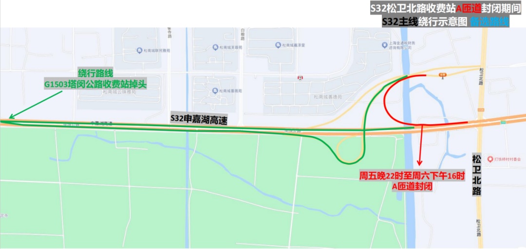市公安局交警总队介绍,近年来,S32申嘉湖高速主线流量不断提升,相应收费站及立交匝道的通行负荷不断增大,部分匝道病害加深,无法通过日常养护进行修复。为消除S32申嘉湖高速松卫北路收费站部分匝道存在的明显病害问题,保证行车安全,计划对病害严重的A匝道和E匝道进行针对性维修。根据施工安排,计划于(5月24日)晚10时至周日(5月26日)上午12时实施维修工作,受匝道宽度限制无法保证车辆正常通行,需实施全封闭。建议驾驶人夜间途经施工路段时,注意按照现场民警指挥和临时交通标志指示进行绕行。详见↓ S32申嘉湖高速松卫北路收费站立交 部分匝道全封闭 点击查看大图 1、A匝道(浦东机场往松卫北路方向匝道):在周五(5月24日)晚10时至周六(5月25日)下午4时实施全封闭。途经车辆转G15沈海高速经叶新公路收费站转地面道路/转G1503绕城高速经塔闵公路收费站掉头绕行至松卫立交E匝道(嘉兴往松卫北路方向匝道)绕行/经G15沈海高速车亭公路收费站转地面道路。 点击查看大图 2、E匝道(嘉兴往松卫北路方向匝道):在周六(5月25日)晚10时至周日(5月26日)上午12时实施全封闭。途经车辆转G1503绕城高速经塔闵公路收费站/转G15沈海高速经叶新公路收费站转地面道路。 点击查看大图 建议驾驶人夜间途经施工路段时,注意按照现场民警指挥和临时交通标志指示进行绕行。