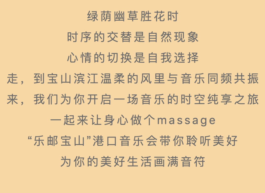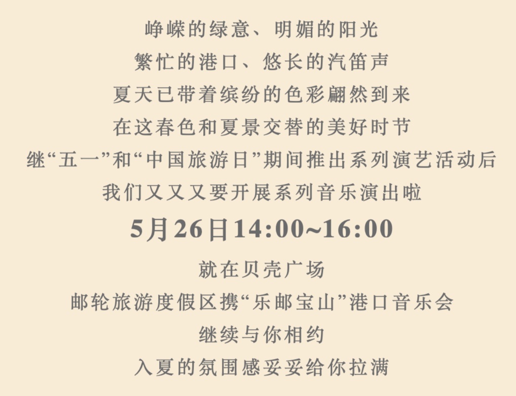 前几场演出演奏的浪漫余温尚存,吴淞口文旅集团携手宝山区文旅局,5月26日继续加码“乐邮宝山”港口音乐会系列活动,打造邮轮旅游度假区专属音乐磁场,绽放邮轮旅游度假区独特魅力和活力。 尽享吴淞炮台湾国家湿地公园贝壳广场传来的声声不息......