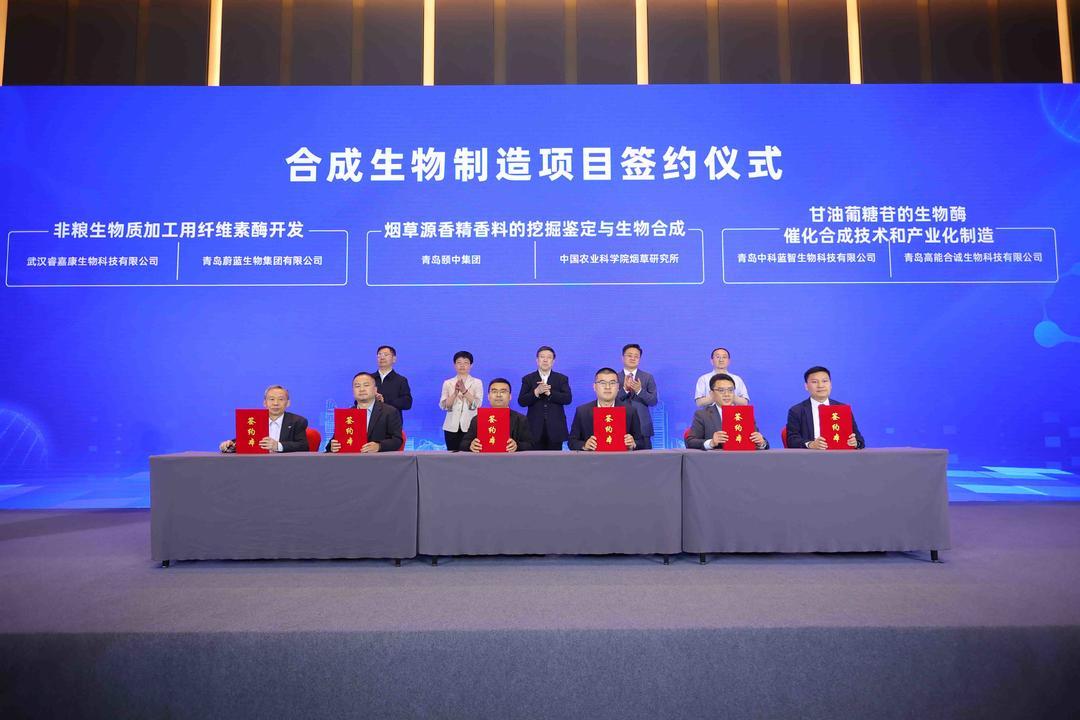开幕式期间举行了项目签约仪式,代谢工程改造微生物生产高附加值产品、酶法合成甘油葡糖苷先进制造技术开发、植物瞬时表达技术平台生产药用蛋白的产业化、非粮生物质加工用纤维素酶开发、烟草源香精香料的挖掘鉴定与生物合成、甘油葡糖苷的生物酶催化合成技术和产业化制造等六个合成生物制造项目相继签约,上述项目的落地将进一步推动青岛市合成生物制造产业的发展壮大。