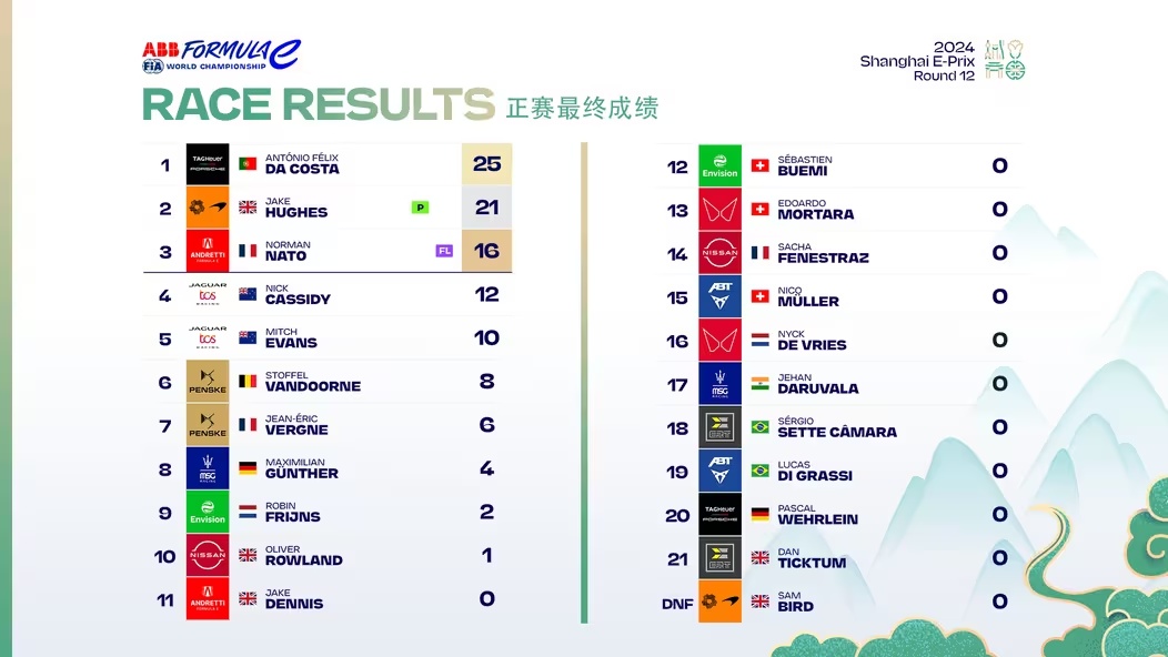 最后一圈比赛,达科斯塔凭借着卓越的驾驶技艺与无懈可击的竞赛策略,成功取得上海站第二轮比赛冠军。杰克·休斯凭借其坚持不懈的努力与临场的稳健发挥收获亚军,而纳托则紧随其后,以非凡的毅力和精湛技巧锁定领奖台的最后一席。中国ERT车队的塞尔吉奥·塞特·卡马拉和丹·提克图姆分别排名第18、第21。