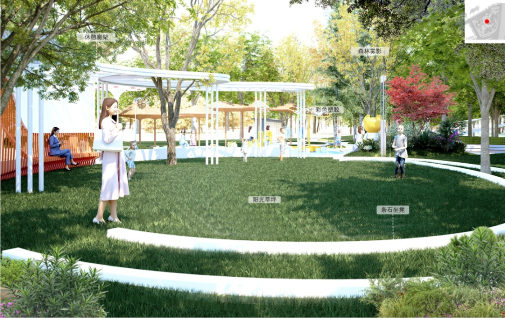 在无乔木区域,将通过增设全龄段活动区域,提升场地整体功能性;借助现有大树林带布置林下休息区,增加架空木栈道,打造有趣冒险的丛林探秘体验区。