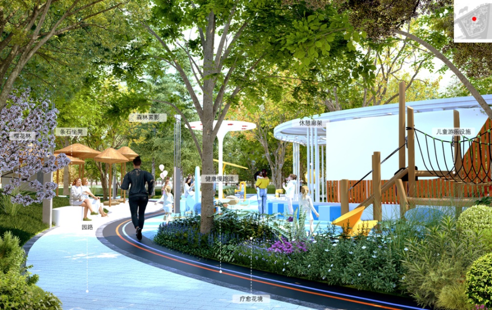 公园内还将设置健身步道、游戏场地、休憩座凳、入口标识等设施,并结合绿化景观提升工程,塑造生态休闲、亲子游乐、童趣多彩的户外空间,提升居民生活幸福感和满意度。