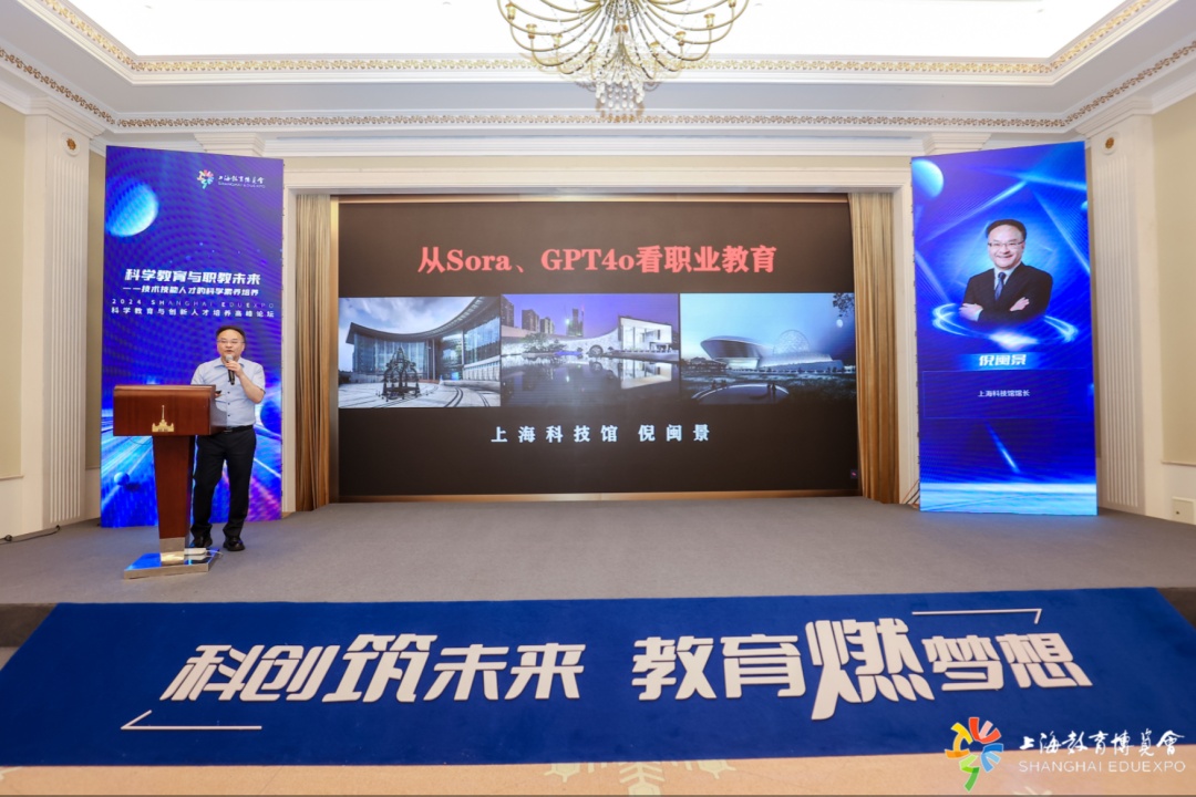 “一带一路”国家职业教育数字化研修班代表也在论坛上带来案例分享,各国职业教育改革发展的不同经历与实践,为与会者带来职业教育发展不同土壤下的理念与见解。上海科技馆馆长倪闽景作“从Sora、GPT-4o看职业教育”的闭幕报告。职业教育未来究竟如何发展?人工智能时代技术技能人才该如何培养?“新技术总是以淘汰老的生产方式来淘汰旧劳动,但新技术总是以创生新的人类需求来创造更多新劳动。”倪馆长用一系列可能诞生在未来的职业,告诉在场听众:人工智能将替代所有把人作为工具的工作。重要的是把人变成具有生命力的种子,具备多样化的思维和充沛人格的人,来适应未来世界的变化与发展。