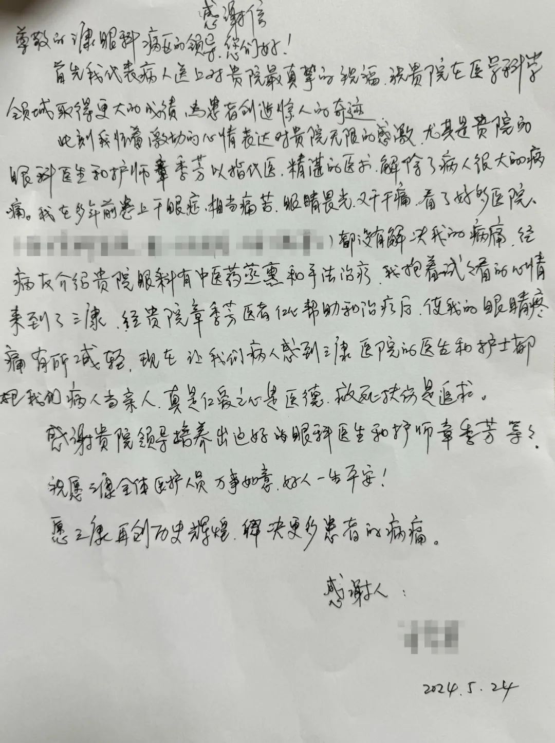 “我要好好谢谢陆医生、章护士,她们给了我光明啊!”5月24日,上海市第三康复医院眼科医护人员收到患者梁阿姨亲手写的一封感谢信。纸短情长,字里行间流露出的不仅仅是感谢,更是一份信任、一份认可。