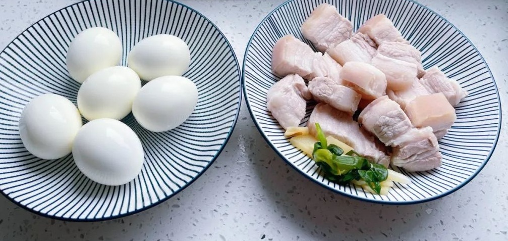 2.五花肉撇去浮沫后,沥干水分备用,鸡蛋煮熟后剥壳备用。