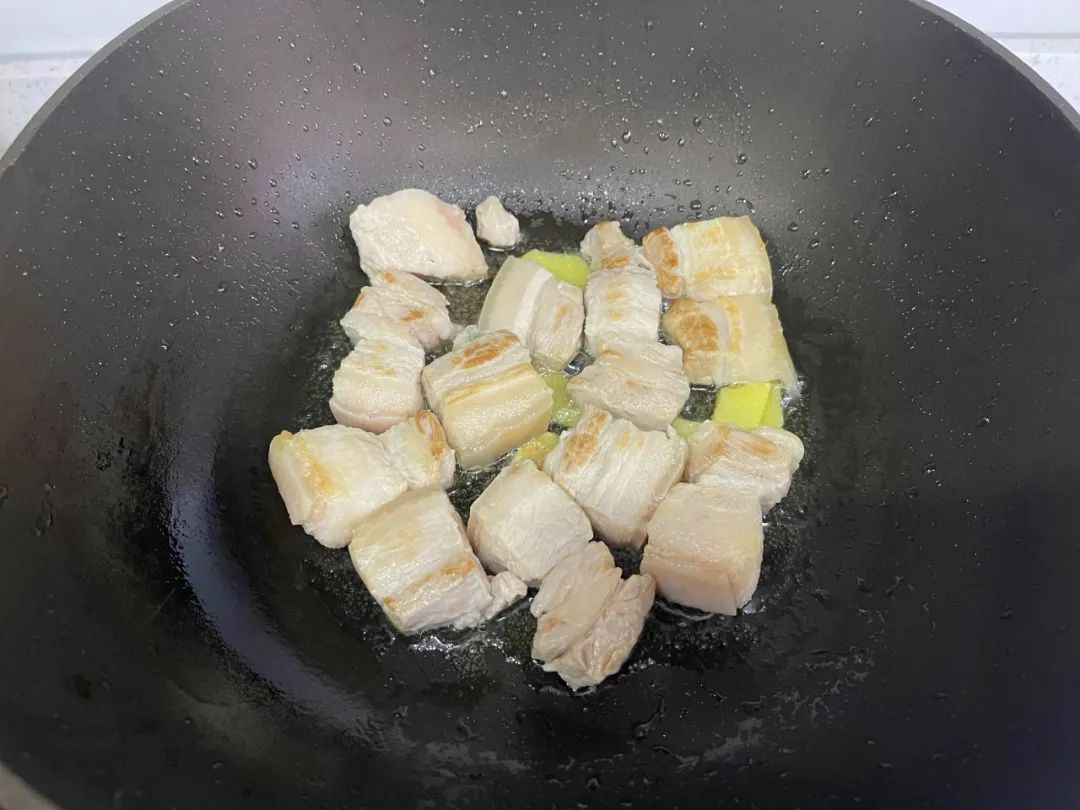 3.起锅,放少许油,小火下入五花肉,煸出油脂,盛出备用。