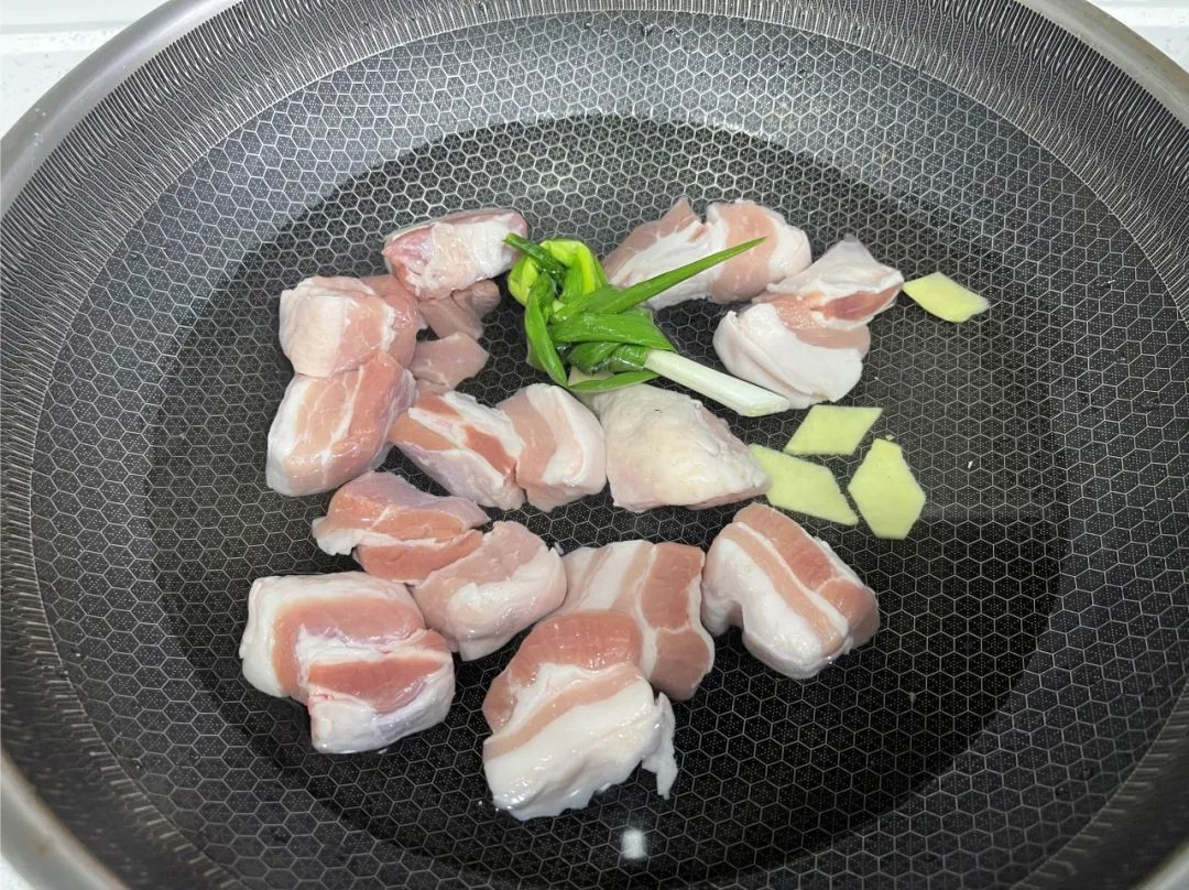 1.五花肉切成块后冷水下锅,加入葱、姜、料酒焯水,撇去浮沫。