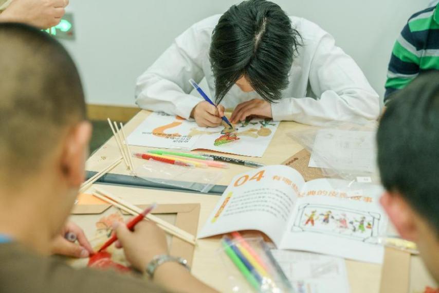 在结束了四十分钟的参观后,师生们来到了手工教室,在老师和蓝背心志愿者的帮助下完成一个自己心目中的皮影人。在大家的共同努力下,孩子们用各自喜爱的颜色为皮影人上色,原本单调的皮影人瞬间变得生动起来,成为了属于每一位孩子自己独一无二的皮影人。
