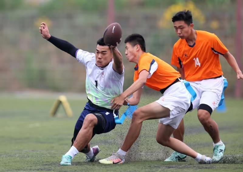 这是山东省首次举办学校层面的腰旗橄榄球比赛。自从腰旗橄榄球被列为2028年洛杉矶奥运会的比赛项目后,这项运动在国内持续升温,平日里约球、打球人的越来越多,而随着腰旗橄榄球从“潮运动”向“专业化”发展,很多学校也开始推广普及这项运动。