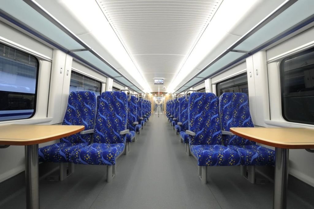 乘坐舒适:车厢内兼顾动车组和地铁车辆优势,采用大宽度通道,人均站立面积是地铁车辆的2倍。车厢内设有茶桌、插座,车厢端部设有扶手,还配有翻转座椅及关爱残疾人设施。