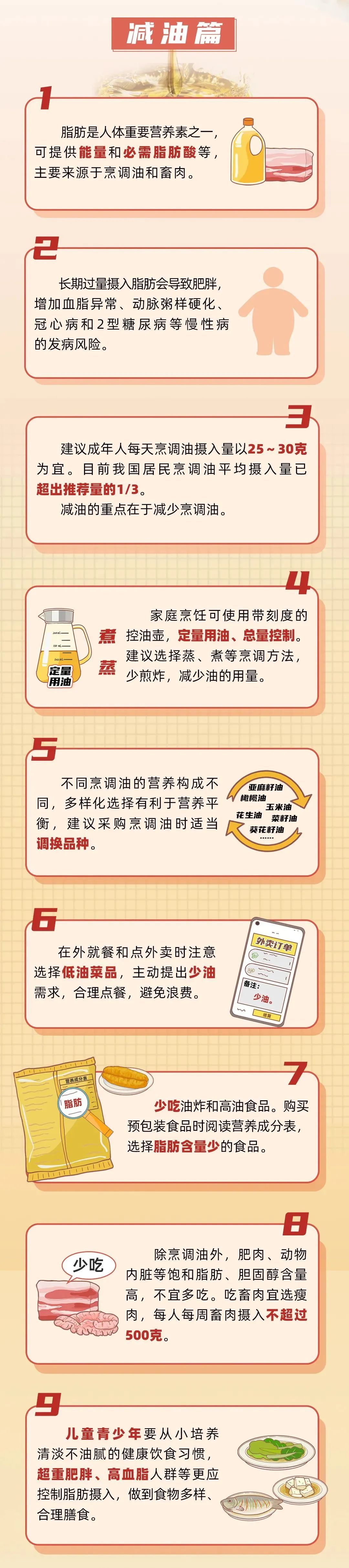 “油”,通常指烹调油,根据来源不同分为动物油和植物油,是人体必需脂肪酸和维生素E的重要来源。但过多的烹饪油摄入会增加增加脂肪的摄入,给身体带来负担,导致肥胖以及一系列相关疾病。目前我国居民烹调油摄入量高,根据膳食指南推荐每天的烹调油摄入量为25~30g。成年人脂肪提供能量应占总能量的30%以下。