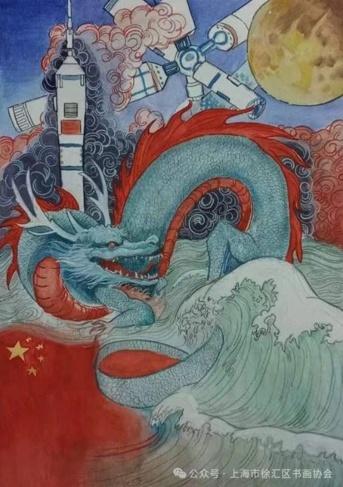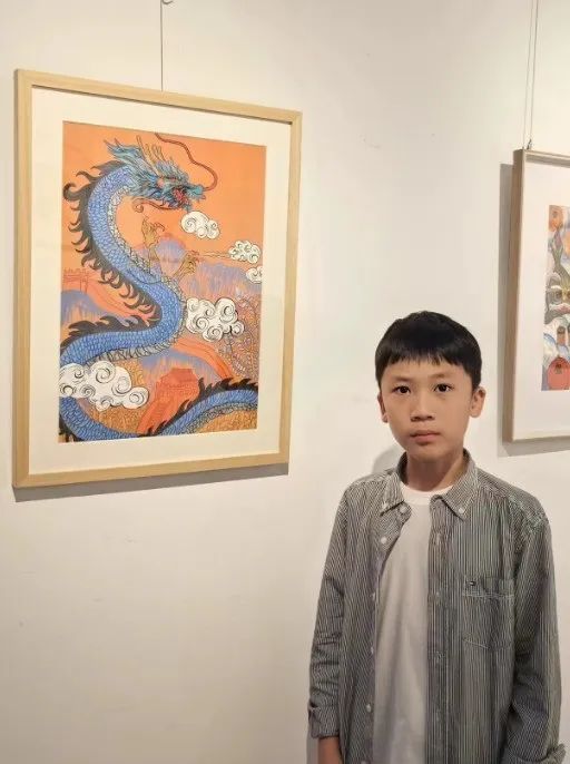 今年是龙年,龙的威武和神奇使它成为小朋友笔下的“宠儿”,动漫龙、中国龙不一而足。“我画这条龙用了S形的构图,用了两组对比色,分别是蓝色和橙色,龙角和龙爪用了金色,肚子用了金色,图中的云彩采用了中国古代壁画的传统画法……”郑迪云很骄傲地向记者介绍自己的作品,他说,龙是属于中国的,很神奇。
