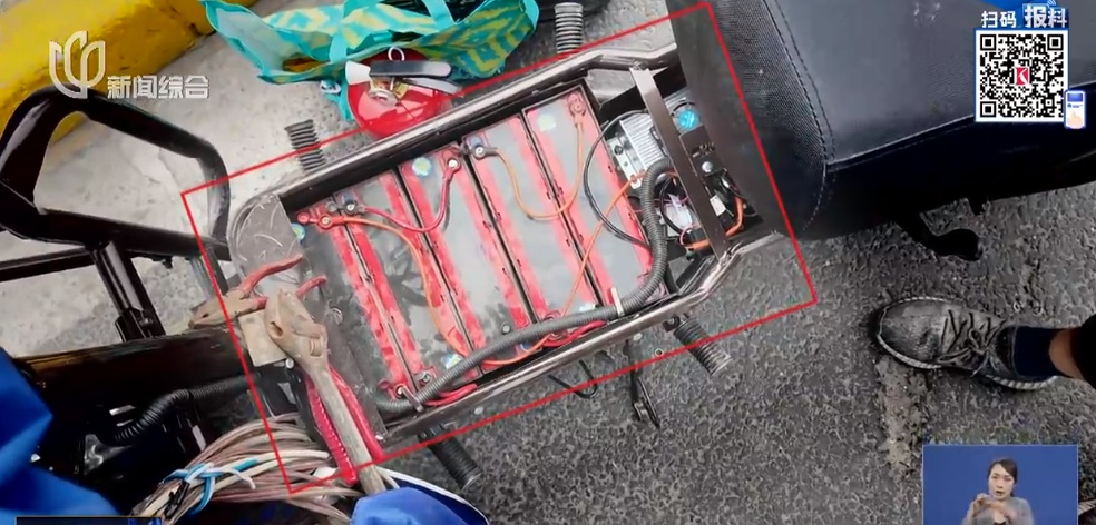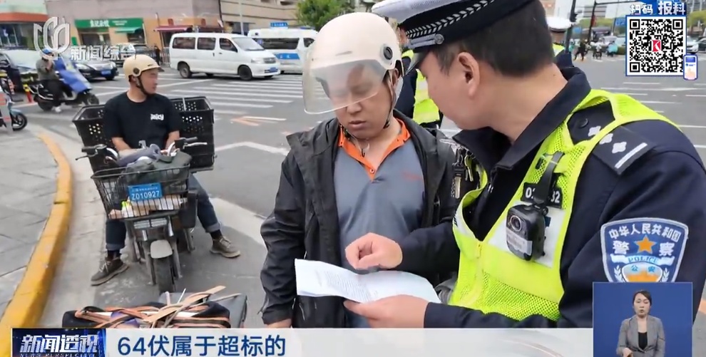 近段时间 电动自行车电池改装、充电等 带来的各种安全问题 持续引发社会关注 近日 上海交警在道路进行例行检查 没想到短短几分钟内 被拦下的这几辆电动自行车 无一例外 都被发现使用的电池组涉嫌超标 甚至有人一辆车里配了5块电瓶! 无一例外!全部涉嫌超标 石龙路龙川北路口,交警随机拦下几辆快速行驶的电动自行车检查。几分钟内,多辆电动自行车,都被发现使用的电池组涉嫌超标。 下面这个电池箱里,5块红黑色外壳的电池,通过导线连接,形成了60伏额定电压,明显超过非机动车标称电压不得超过48伏的标准。 民警表示,比较突出的问题是电瓶加装,不符合48伏的规定,可能会造成电瓶车的事故隐患。
