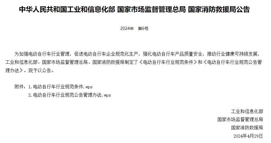 为加强电动自行车行业管理,促进电动自行车企业规范化发展,提升电动自行车产品质量安全水平,推动我国电动自行车行业高质量发展,工业和信息化部会同市场监管总局、国家消防救援局编制了《电动自行车行业规范条件》(以下简称《规范条件》)、《电动自行车行业规范公告管理办法》(以下简称《管理办法》),于4月30日正式印发。