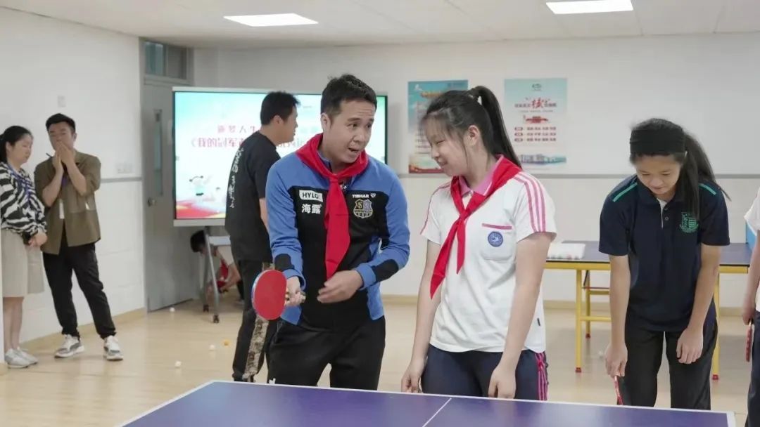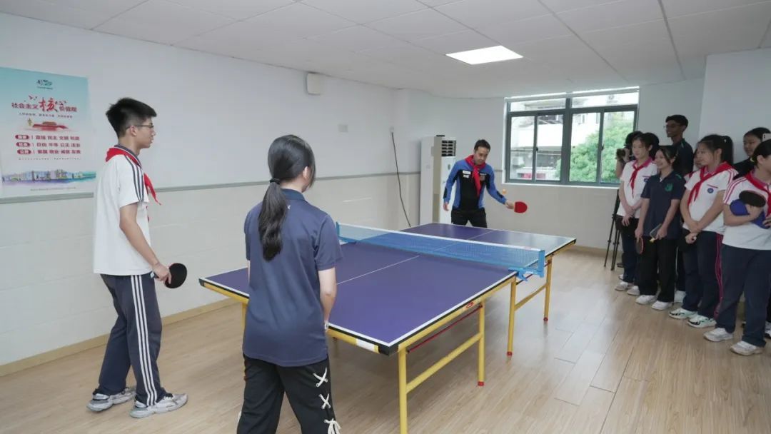 活动最后,尚坤指导学生们进行了一场酣畅淋漓的乒乓球训练。“两年没打球,手有点生,认真打的话还行。”真北中学乒乓球队队长徐婧安告诉记者,自己从一年级起就在专业教练的指导下开启了乒乓球生涯,还参加过市运会并取得了不错的成绩。来自新加坡瑞士村中学的陈紫譞则是自告奋勇,“2V1”体验了一把尚坤精湛的球技和教学,切身感受乒乓球运动的魅力。“我觉得很好玩,因为那个球很快,所以我学到要专心看球打。”陈紫譞说,自己是在体育课上第一次接触到乒乓球的,在尚坤老师的指导下,她对于乒乓球的力度控制有了新的感悟。