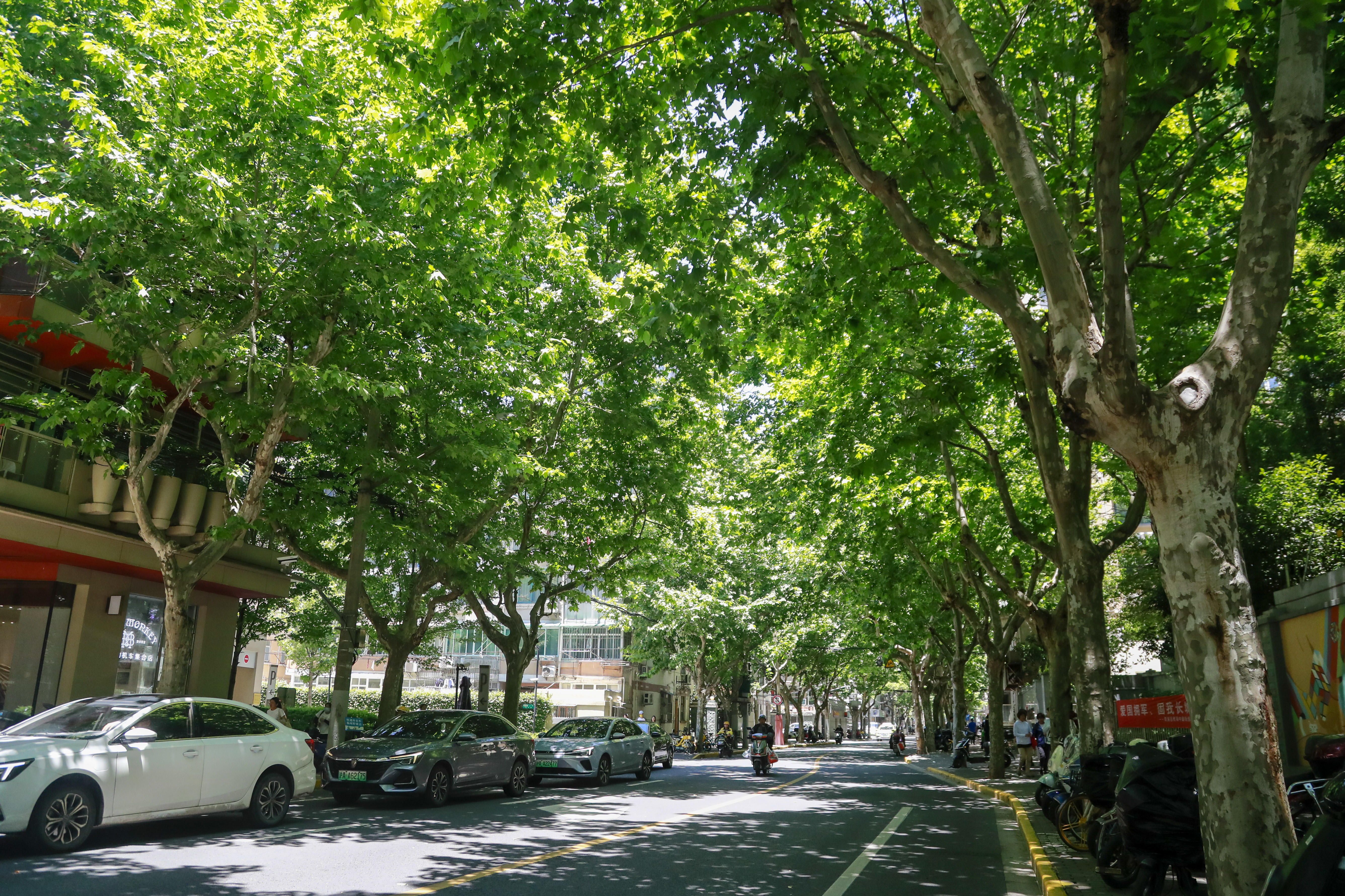 合肥路(重庆南路—黄陂南路)共600米左右长,枝繁叶茂的悬铃木伫立在两旁,像极了一个个弧形的穹顶,为漫步在路上的市民送上了独有的“凉意”。
