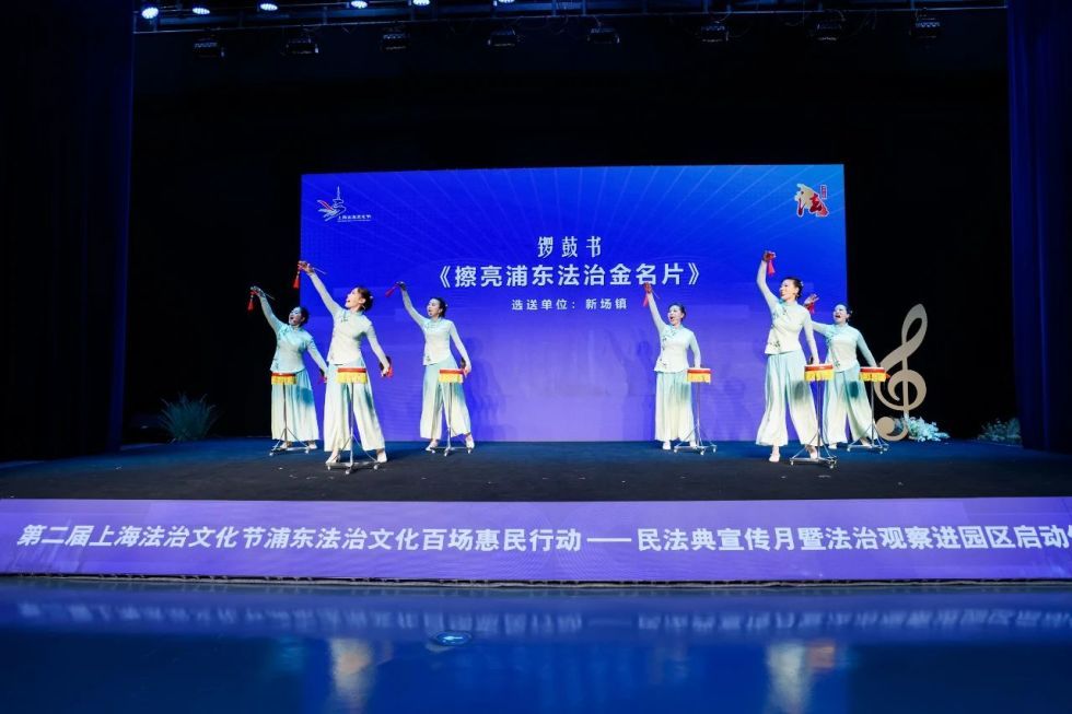 启动仪式上,三林镇舞龙队浦东绕龙灯表演《龙腾獬跃》、锣鼓书表演《擦亮浦东法治“金名片”》、独脚戏《民法典就是好》、伞舞《惊鸿伞舞,法护塘桥》、法治故事《分段承包》以及浦东山歌《“典”亮你的生活》进行了展演。