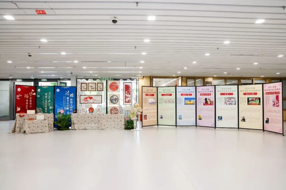 活动外场,国家级非遗上海绒绣《法治高桥》、上海市非遗三林瓷刻《党建引领 依法治国》、浦东喜庆剪纸习俗《法治浦东》、浦东剪纸《美好生活 法治相伴》等优秀非遗法治文化作品,以及新场彩豆画,高行四大名著趣味普法,陆家嘴小陆学法文创产品等展出引人驻足观看。