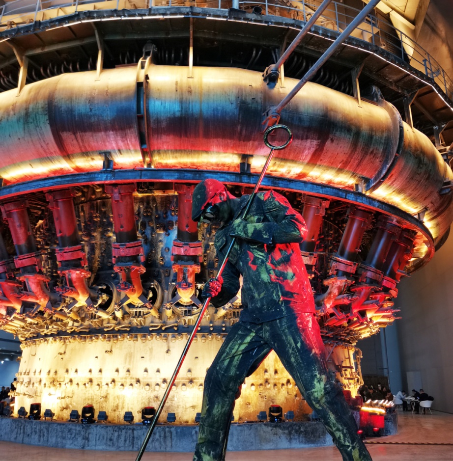 乘坐扶梯来到二层,穿越“时空隧道”,就能抵达会博中心最热门的网红打卡处——“金色炉台”,这里便是曾经的上海第一钢铁厂2500立方米高炉。它独特的历史元素与新时代的各类展品完美结合,充满了工业文明时代的沧桑韵味。