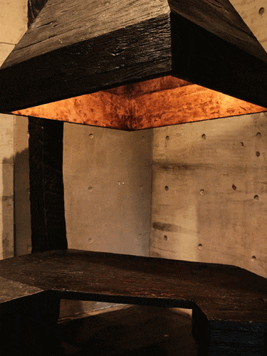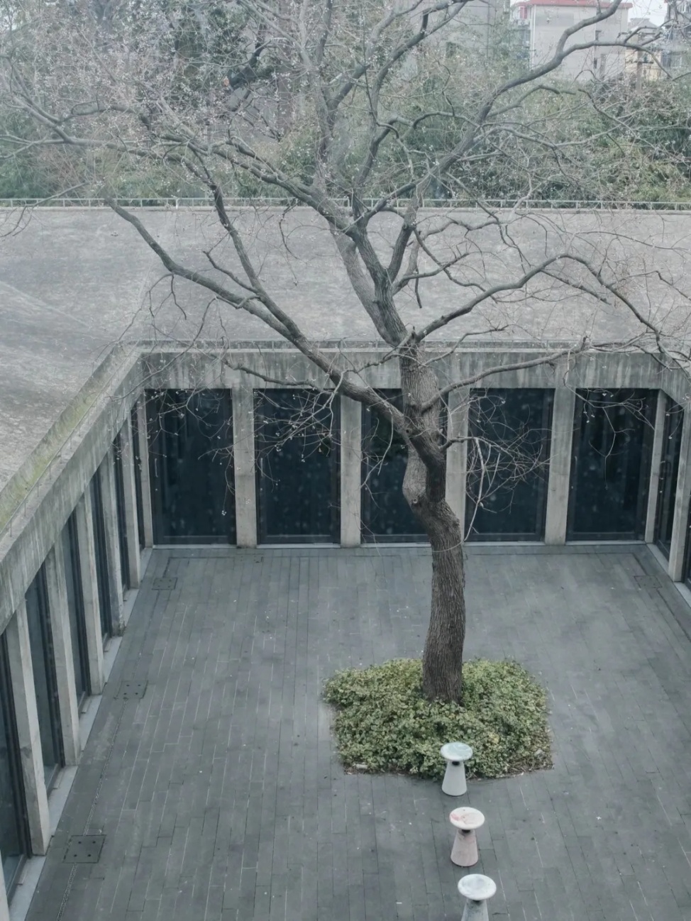 布置美术馆各个角落的家具,所用材料也都不简单,梨花、紫檀木等,金漆点缀其中,充满古典韵味。中庭室外,四四方方,中间种上了一颗树,二楼的屋顶的高低斜切面,形成一种错落有致的空间延伸感。