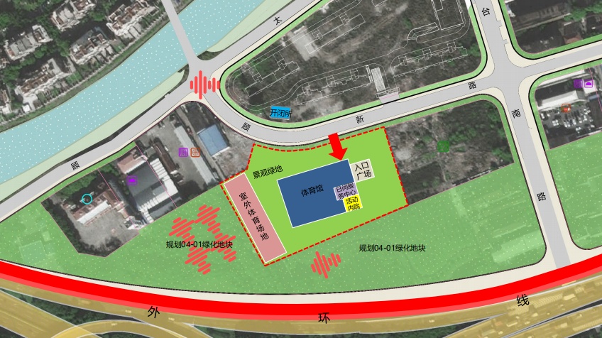 体育馆项目位于顾村老集镇“城中村”改造项目04-05地块,东至规划04-06幼儿园地块、南至规划04-01绿化地块、西至规划04-01绿化地块、北至顾新路及规划居住用地。