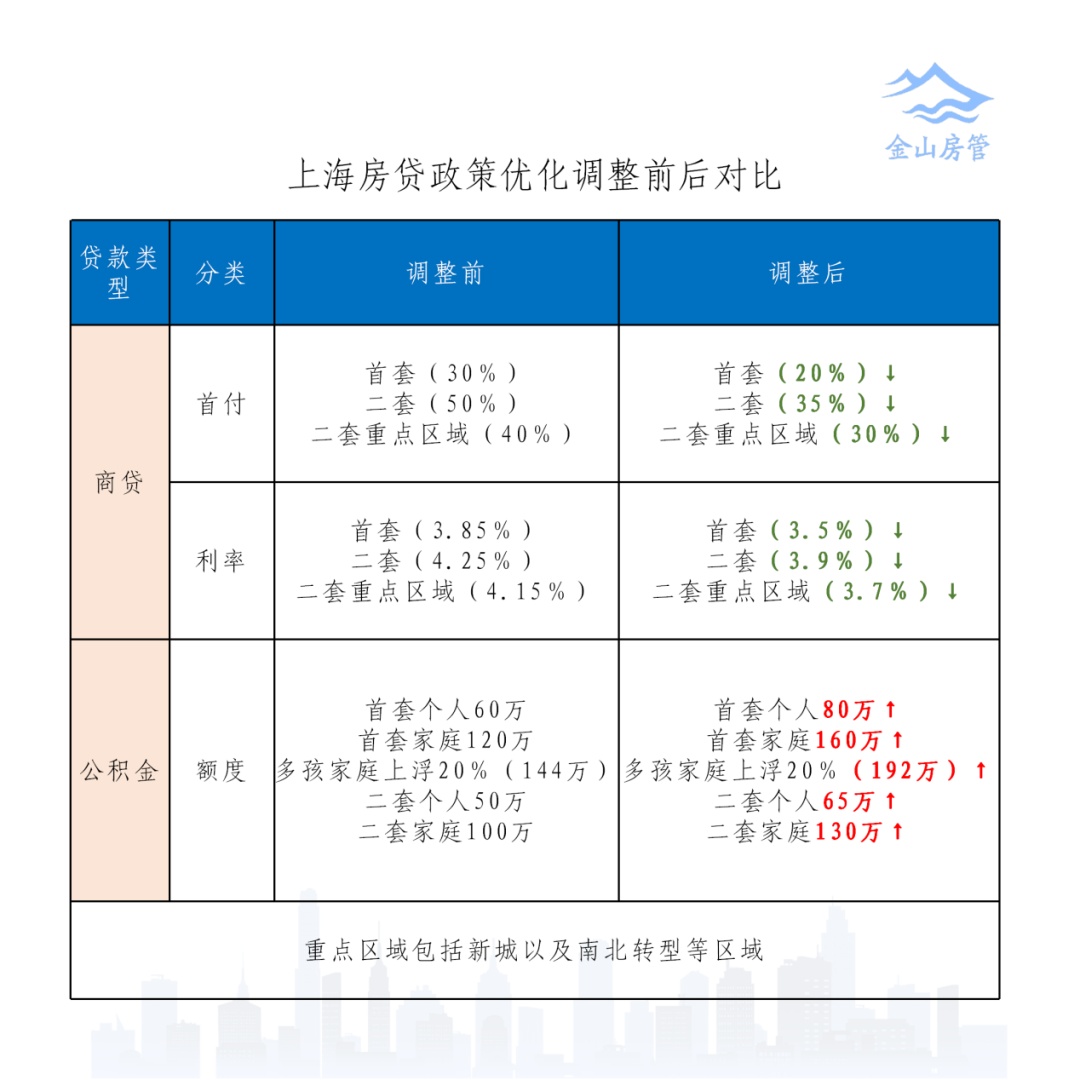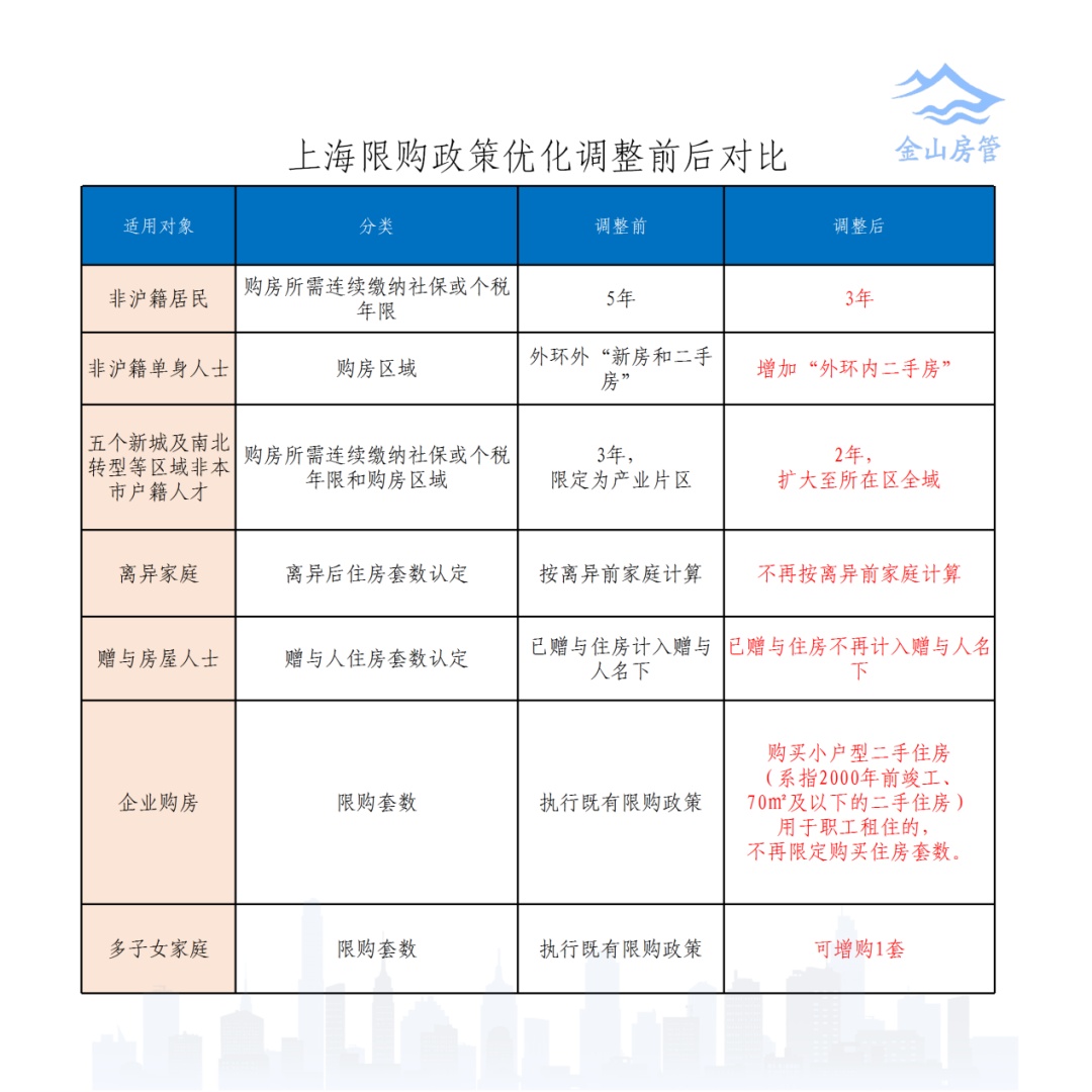 首先住房限购政策调整方面,包括缩短非沪籍居民家庭以及单身人士购房缴纳社会保险或个人所得税的年限,优化购房区域,取消离异购房限制,完善住房赠与管理。同时支持多子女家庭购房,包括在现有住房限购政策基础上,增购1套住房,优化首套住房认定标准,减少购房利息负担。金山作为南北转型重点区域,非本市户籍人才购房所需连续缴纳社保或个税年限和购房区域由“3年、限定产业片区”调整为“2年、所在区全域”。