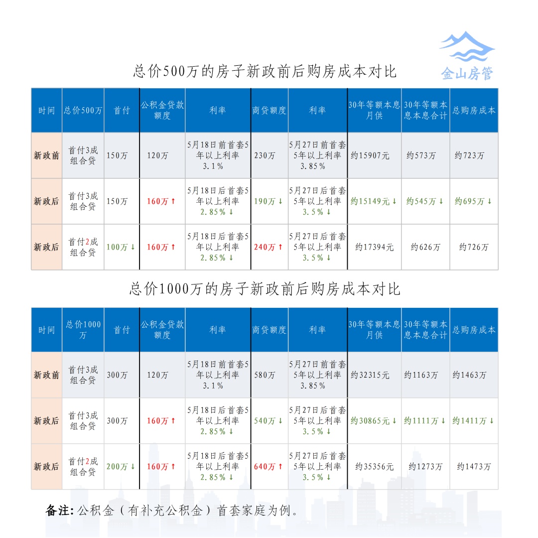 总价500万的房子月供为15149元,总购房成本695万元,比原先分别减少约758元和28万元;