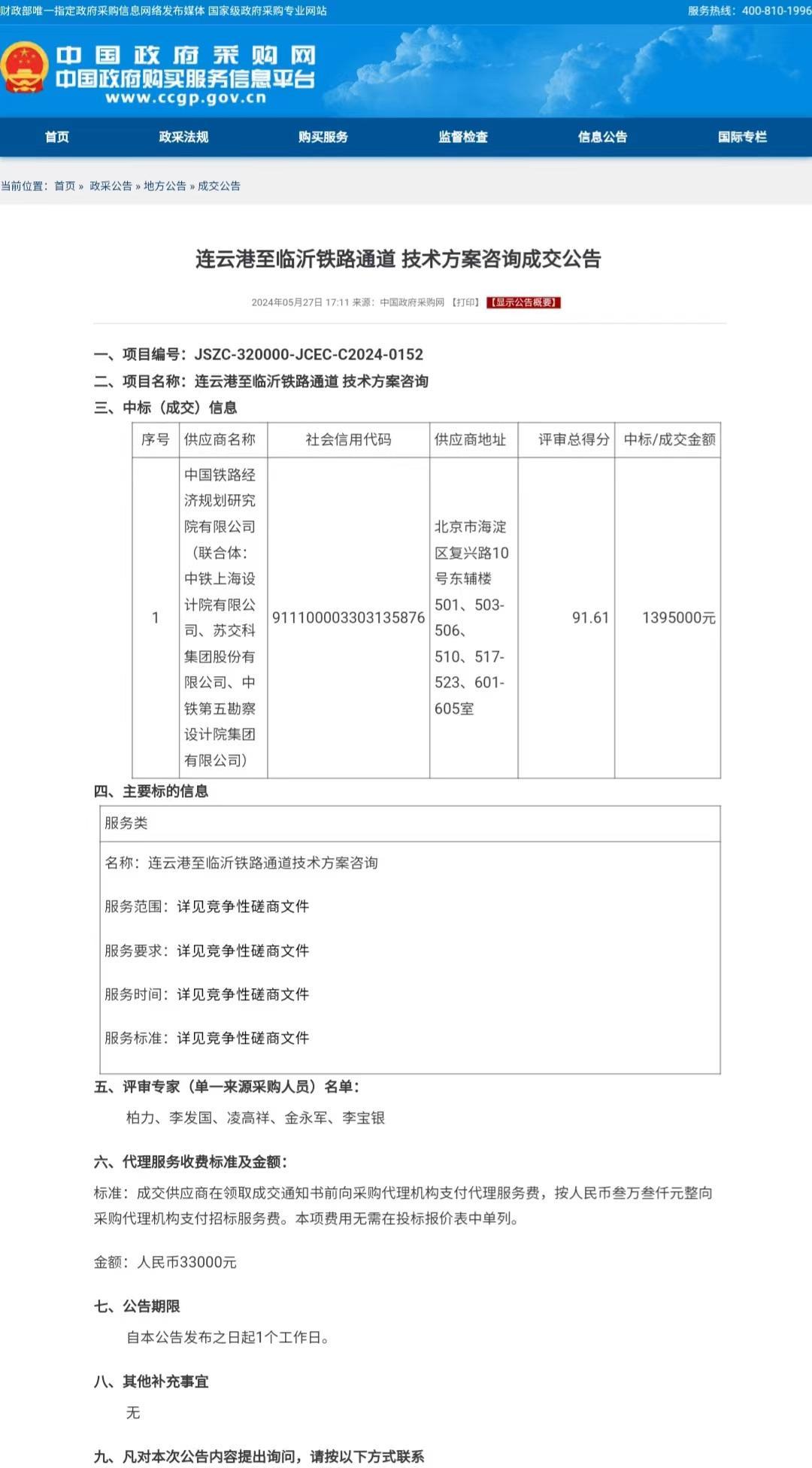 连云港至临沂铁路通道技术方案咨询成交结果公告发布。图源:中国政府采购网