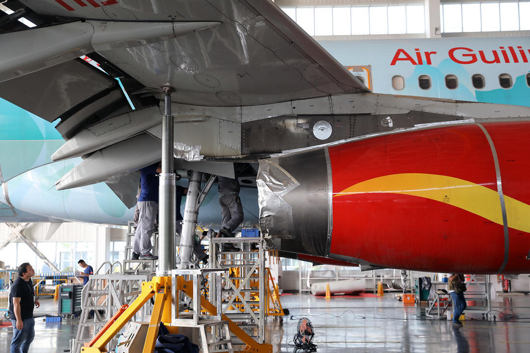 工人正为桂林航空的一架客机作保养维修。
