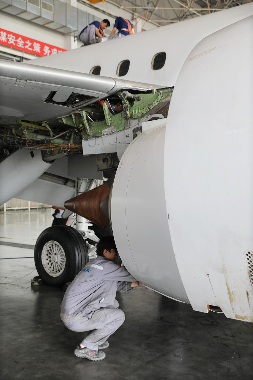 一位工人蹲在地上检查发动机,与此同时,两位系着高空作业保险绳的工人正在机身上进行维保作业。