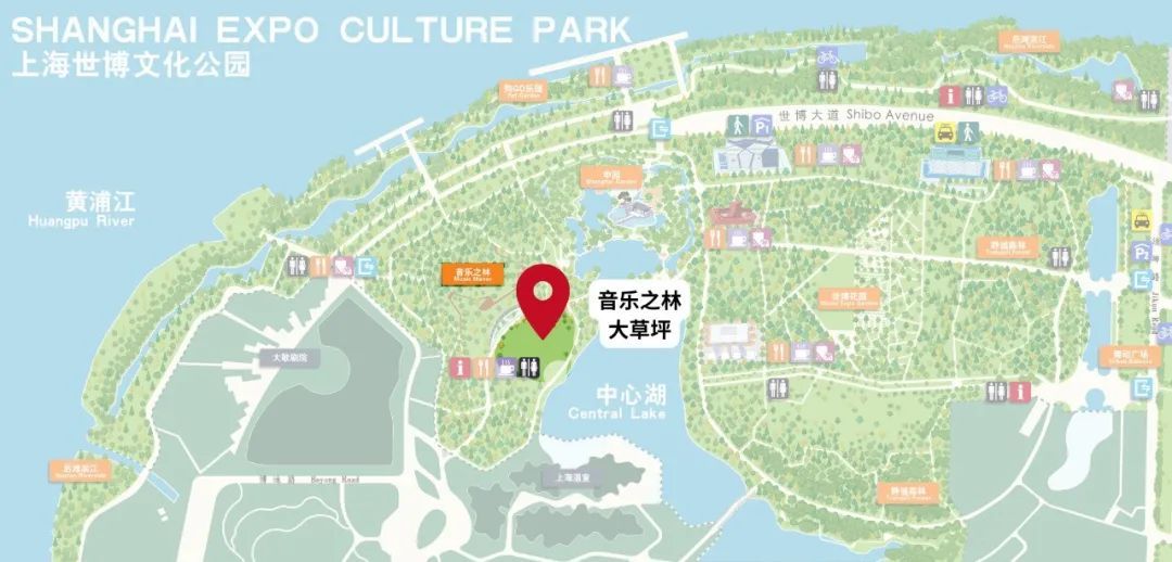 打车或网约车的朋友们可以将导航目的地定位在“上海世博文化公园融合段停车场”,下车后进入公园,按照公园指示牌中“音乐之林”的方向就可以步行到大草坪啦。