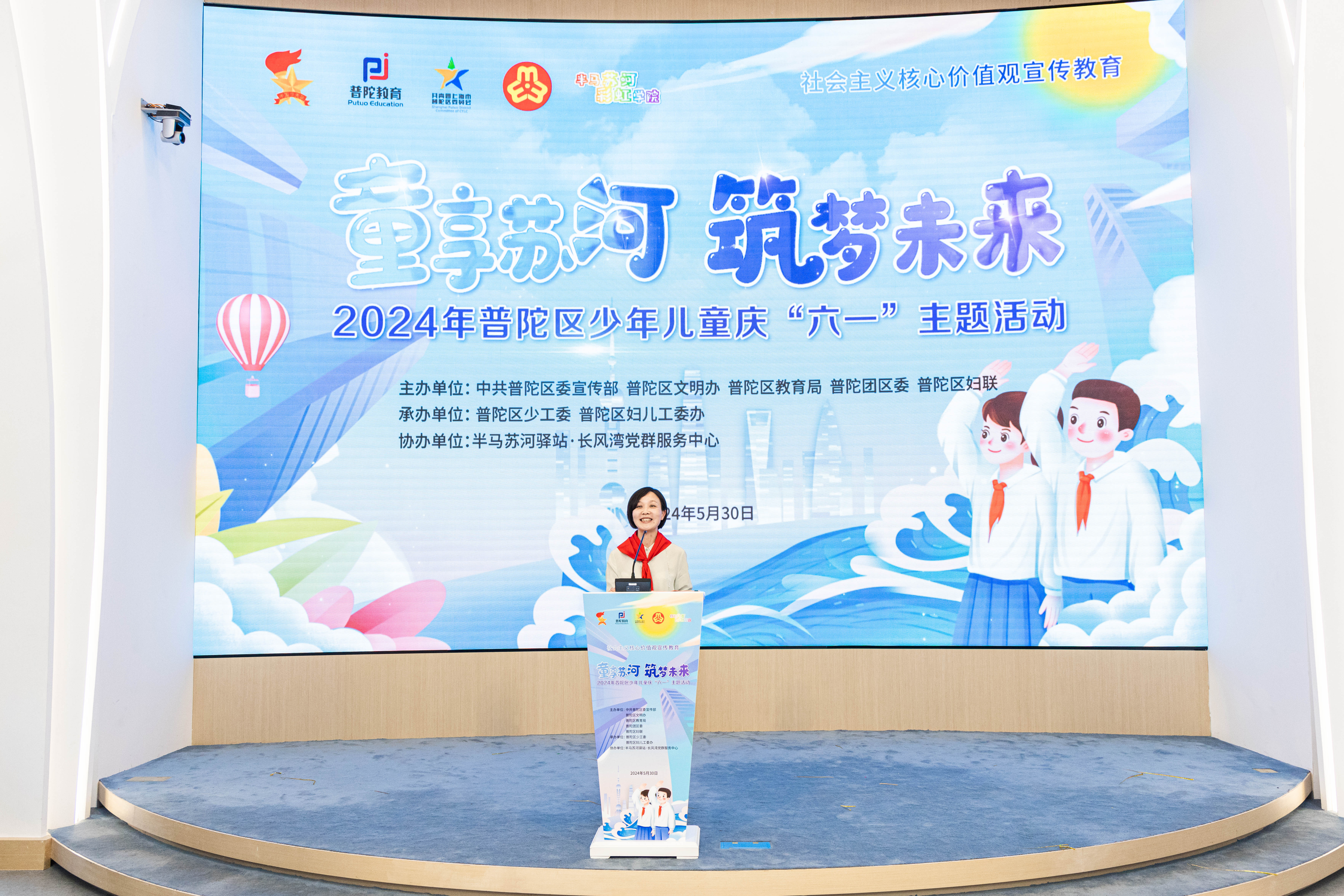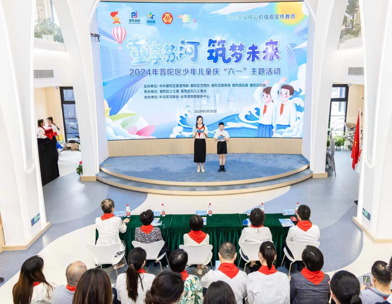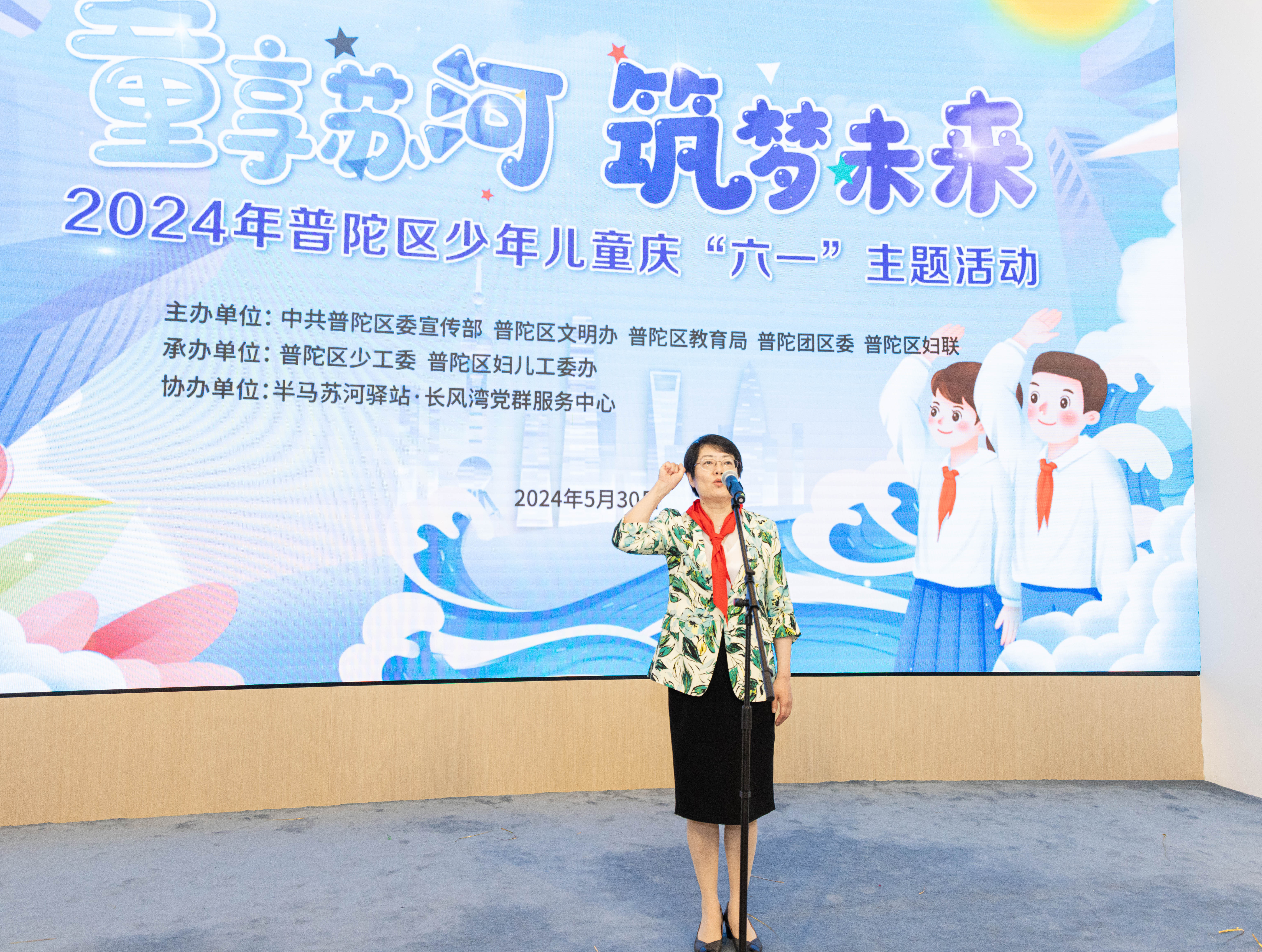 5月30日,“童享苏河 筑梦未来”2024年普陀区少年儿童庆“六一”主题活动在半马苏河驿站•长风湾党群服务中心举行。区委副书记周艳出席并致辞。区人大常委会副主任杜娟,副区长王珏,区政协副主席欧阳萍出席。团市委、区教育局、团区委、区文明办、区妇联相关领导,以及全区少先队员代表、少先队工作者齐聚一堂,共庆“六一”。