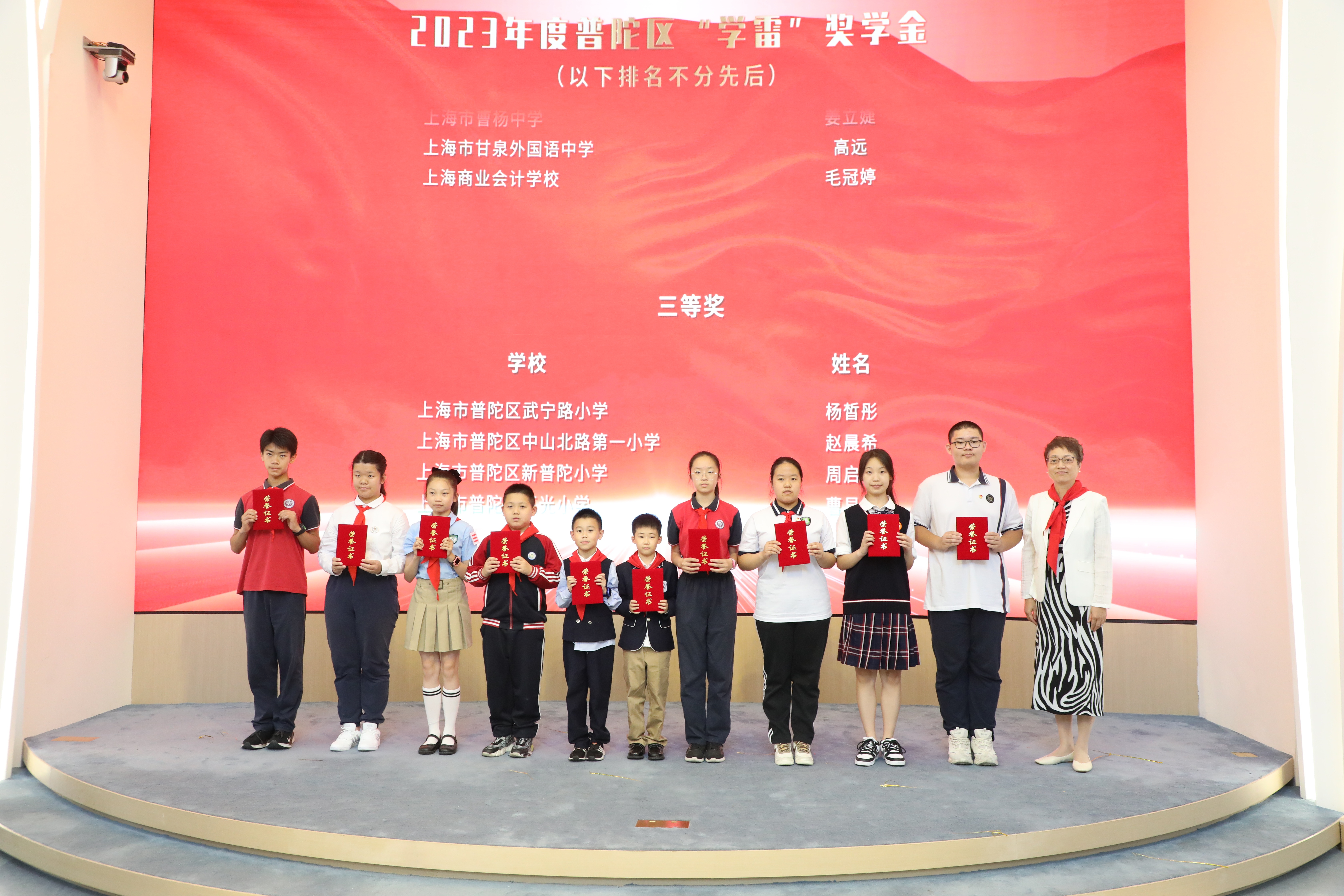 为2023年度普陀区“学雷”奖学金代表颁发证书
