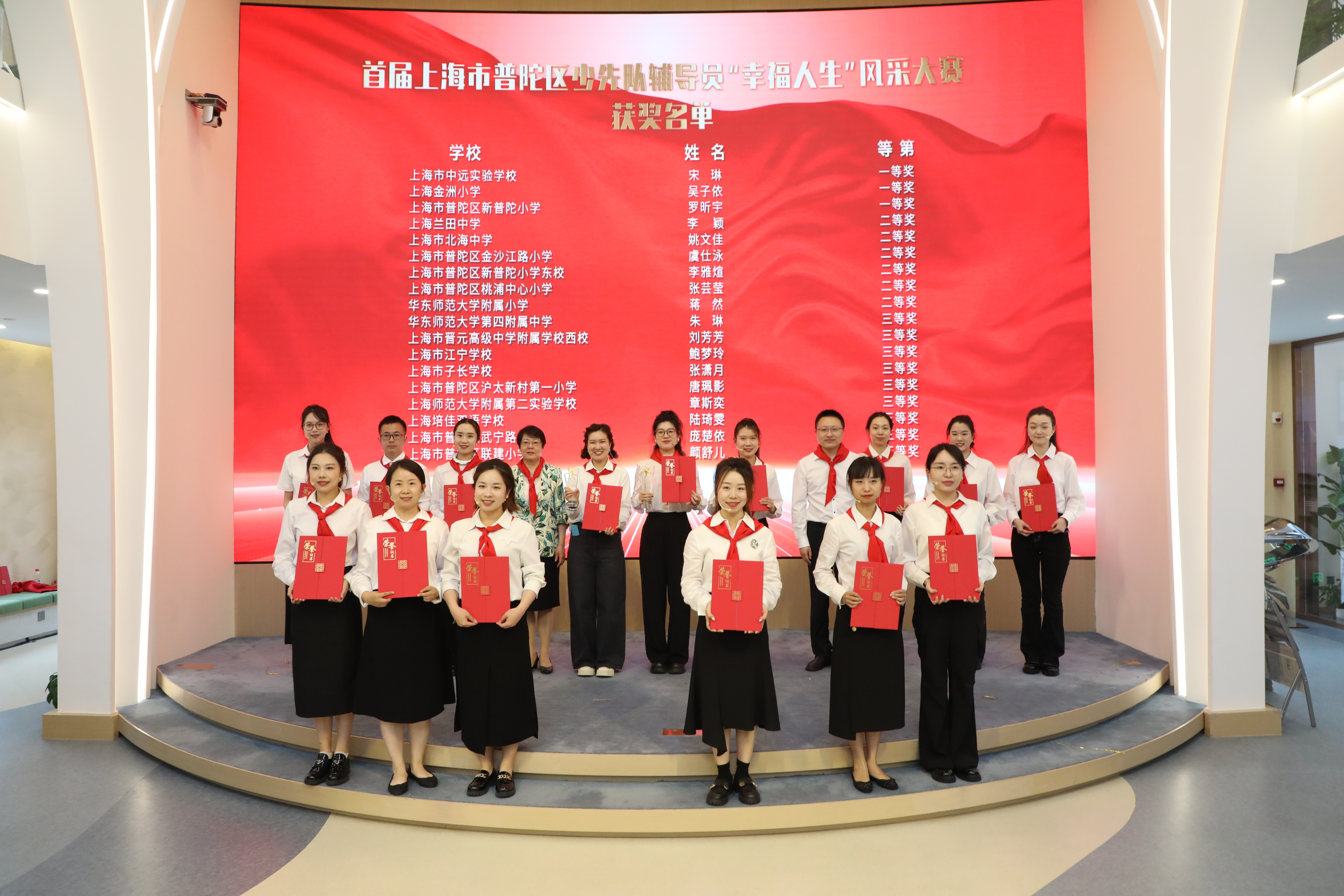 为首届普陀区少先队辅导员“幸福人生”风采大赛的获奖代表颁发证书